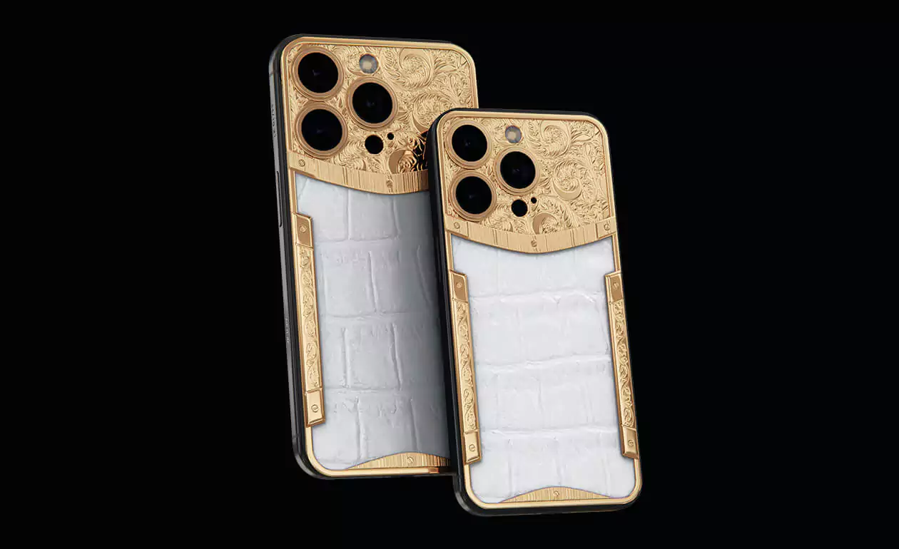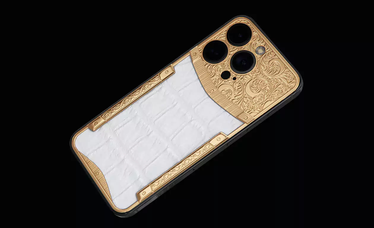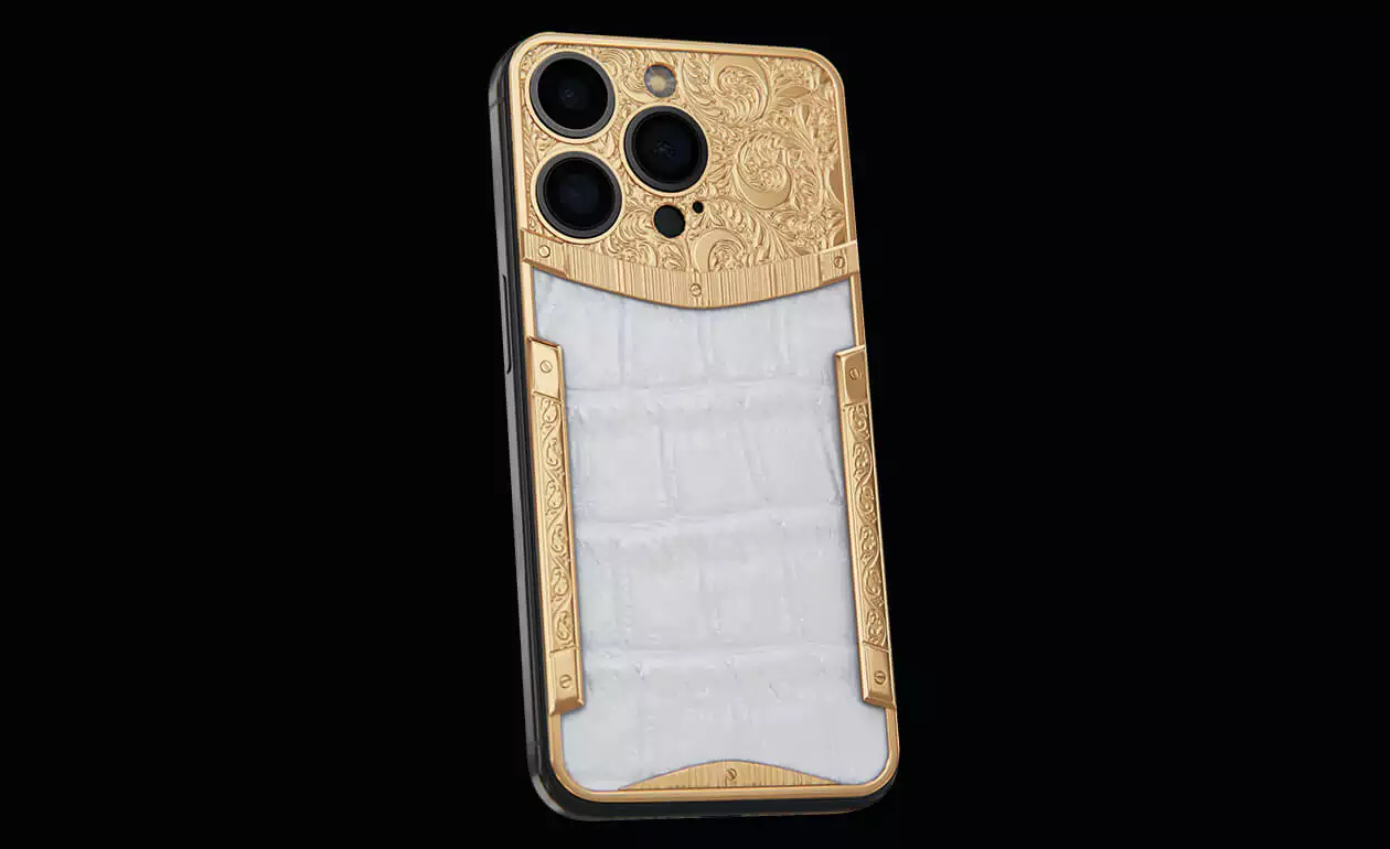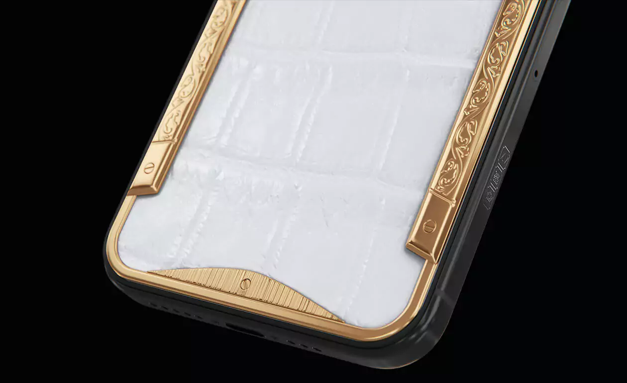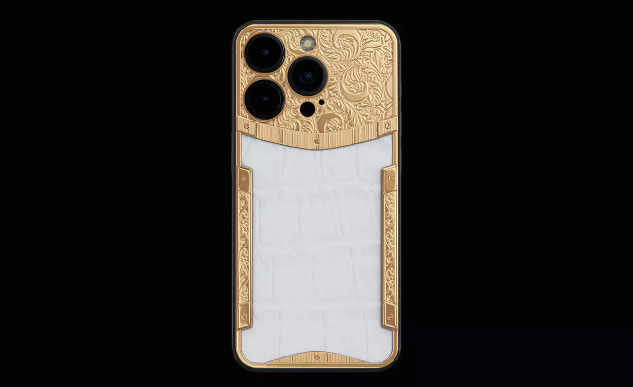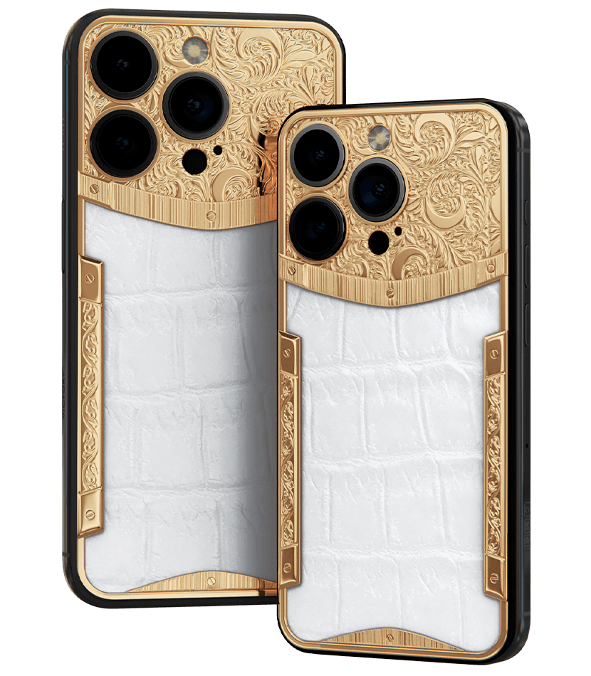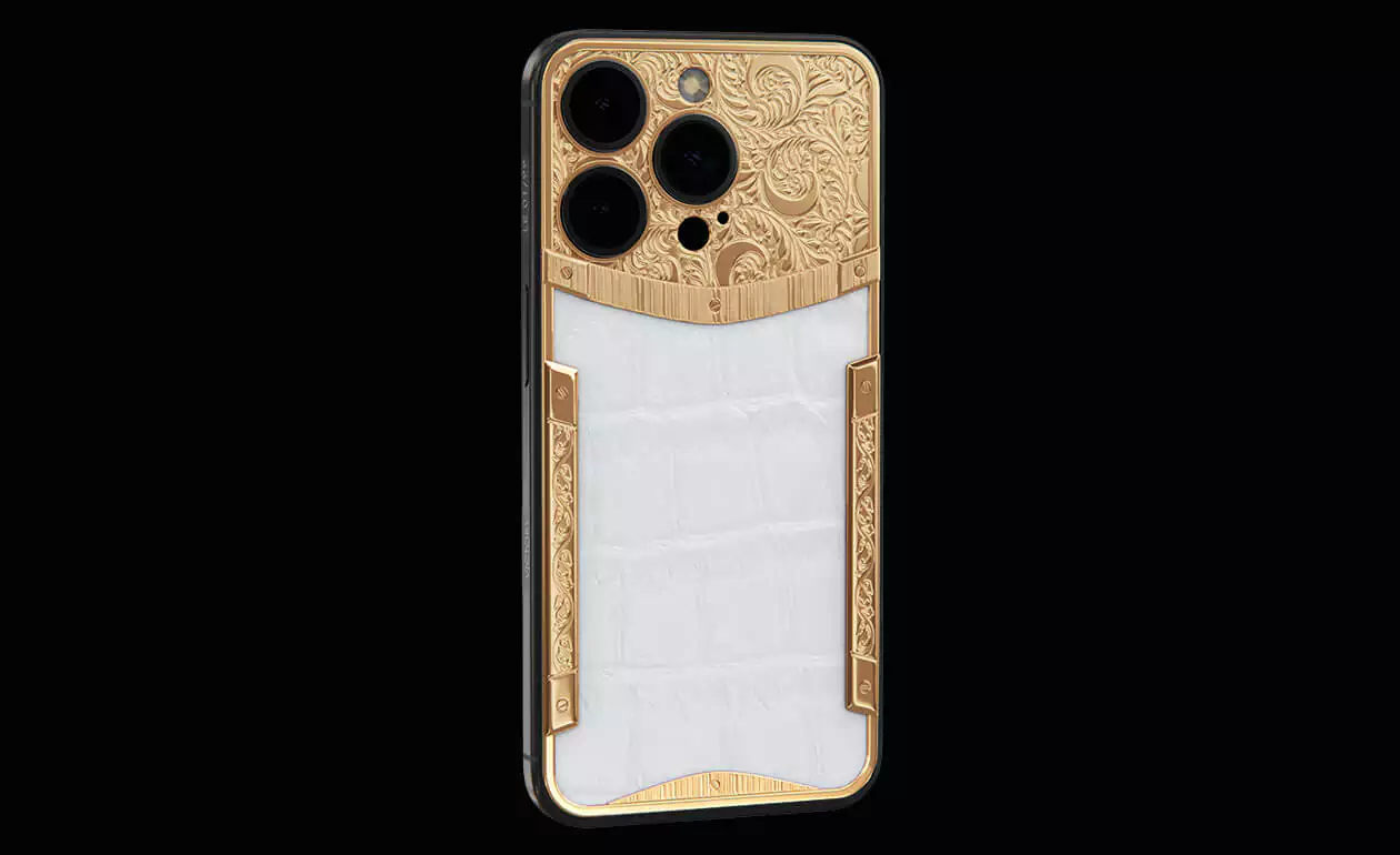Victory Gold Wind is a deluxe interpretation of the new iPhone 14 Pro color. The solid 18K rose gold body is delicately decorated with satin finish. The back of the smartphone features the insert of a crocodile leather of the purest white color. This model is the very embodiment of tenderness and sophistication.