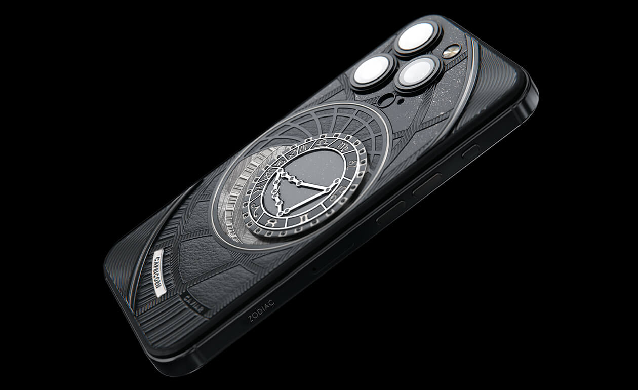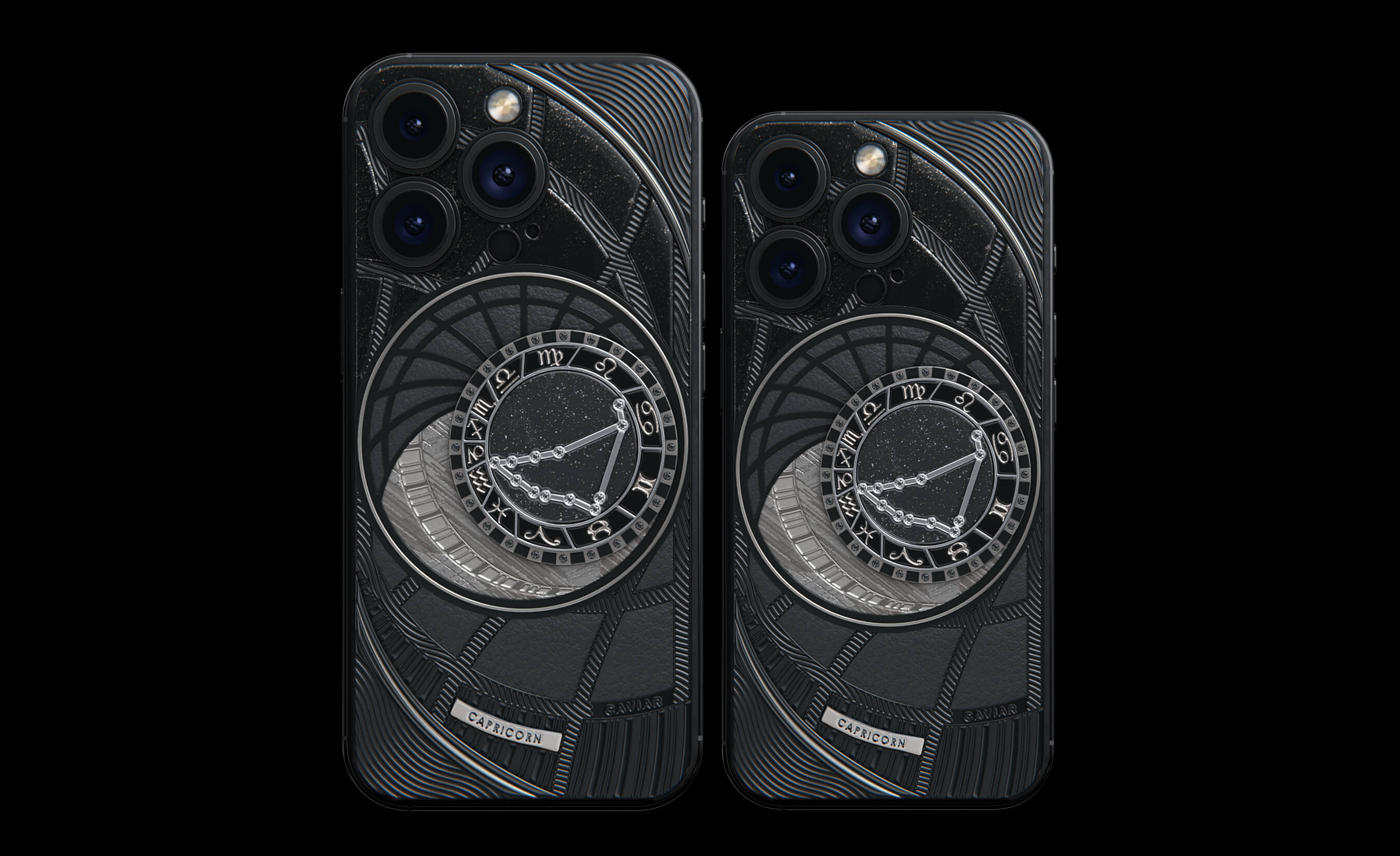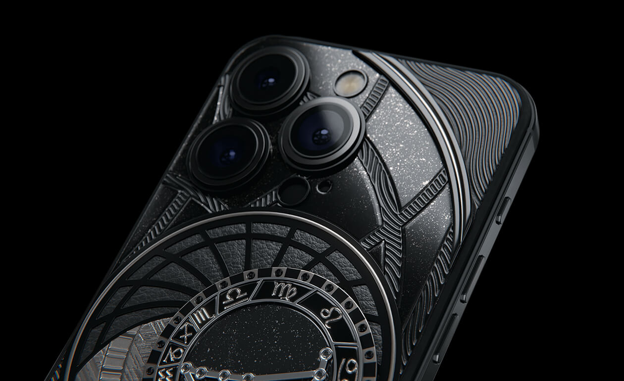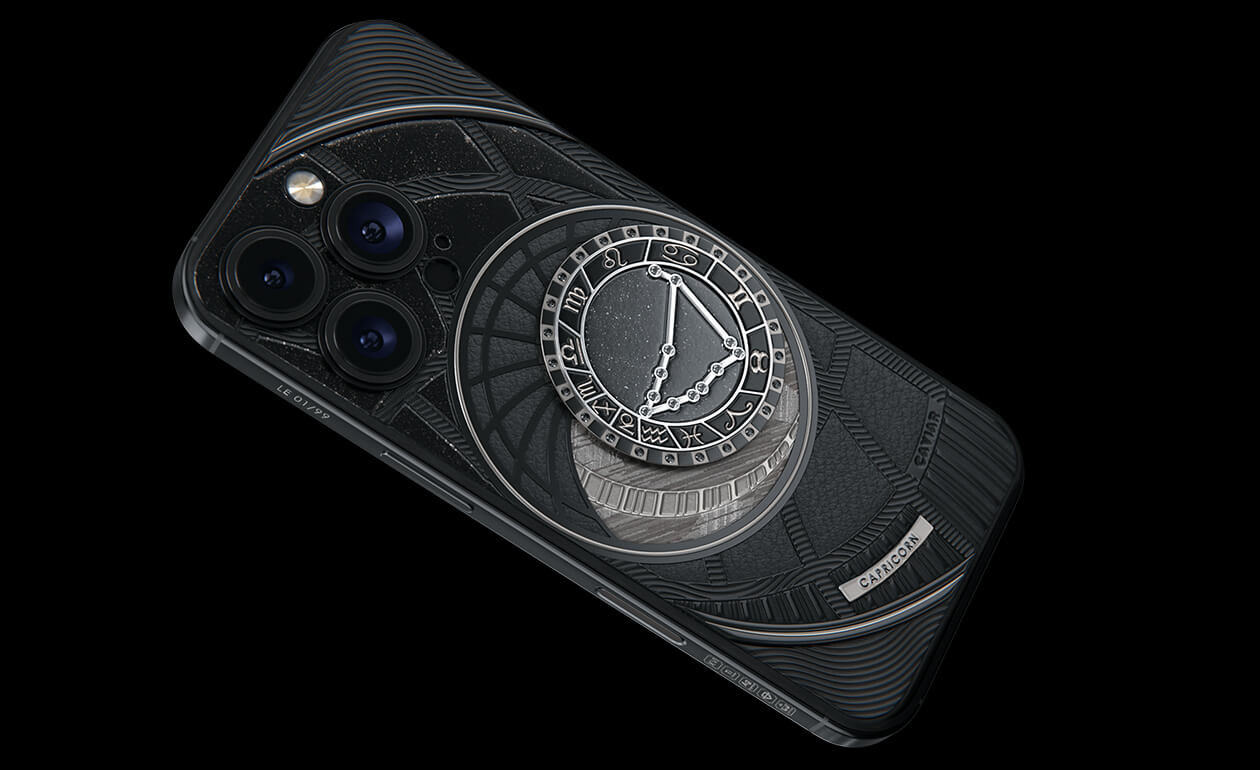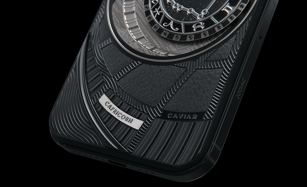 Capricorns, today we present to you Capricorn. Your smartphone has a sky vault with your stars on it. This is a panel of 24 black zirconia, created on titanium with a PVD coating. We highlighted the shine of the black diamond plaque with an black composite and finished the composition with a meteorite fragment on classic black calf leather.