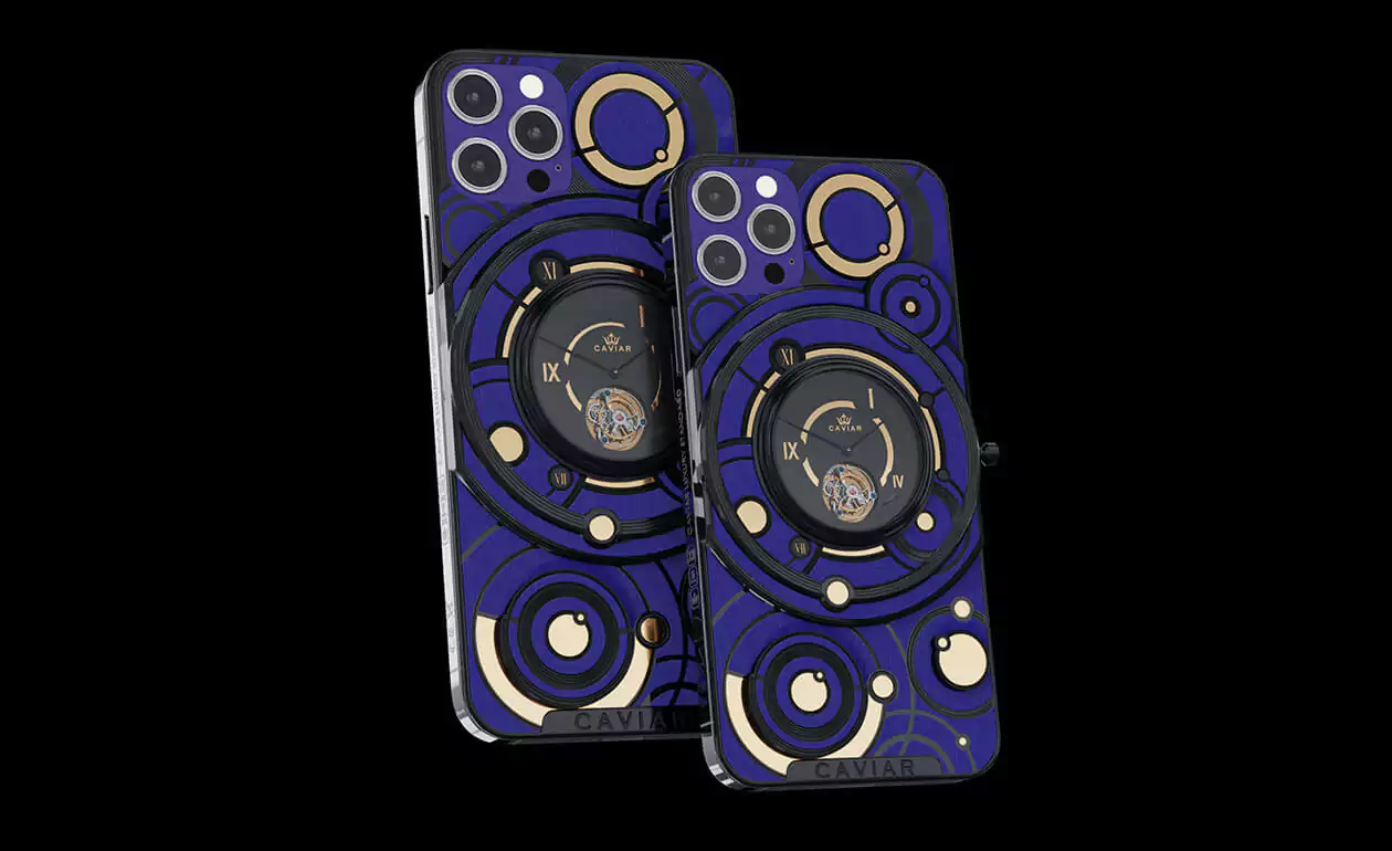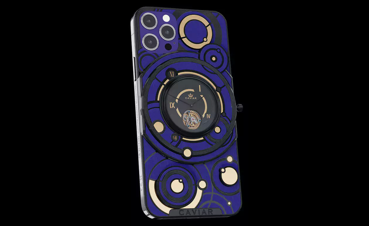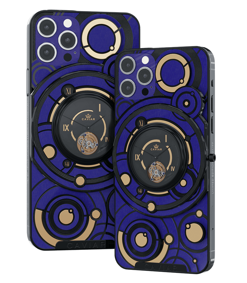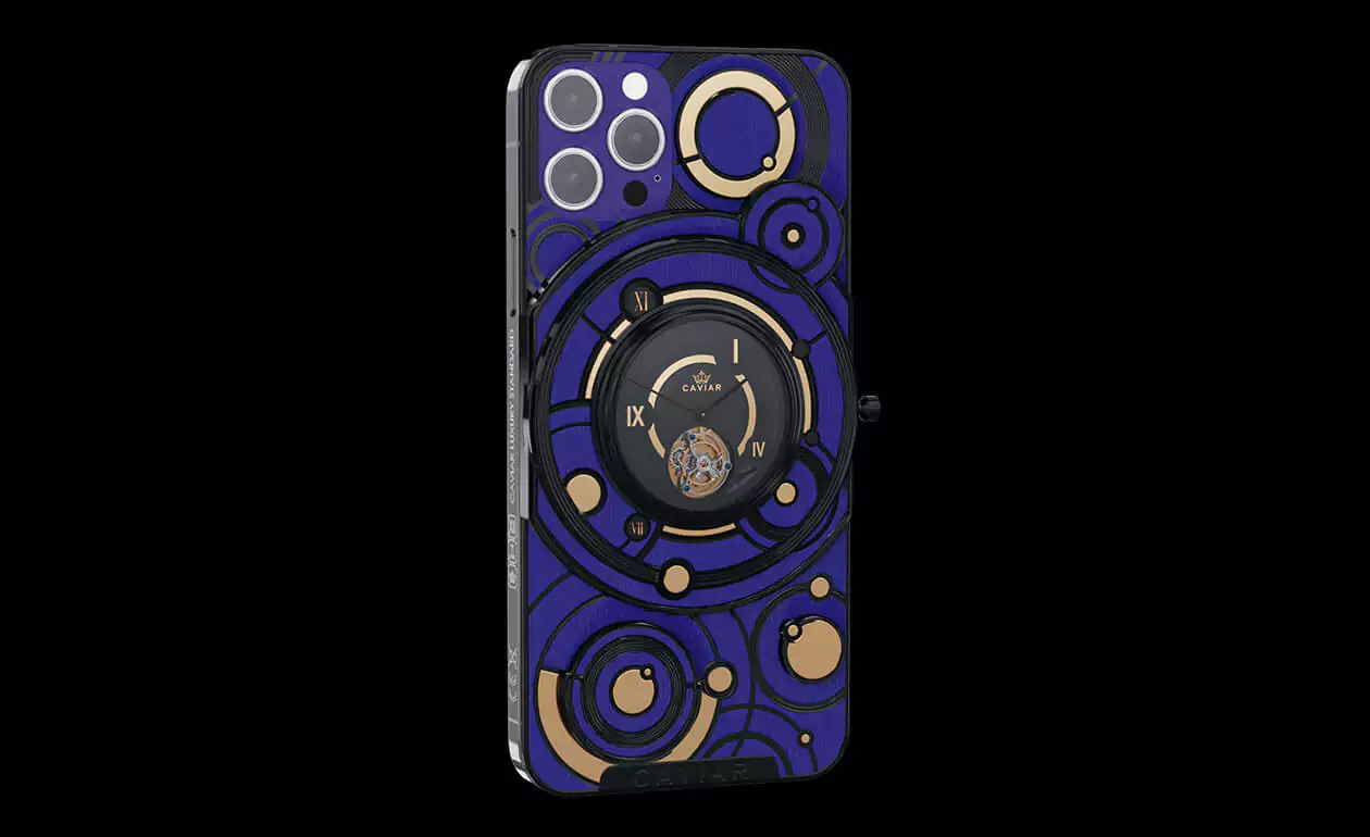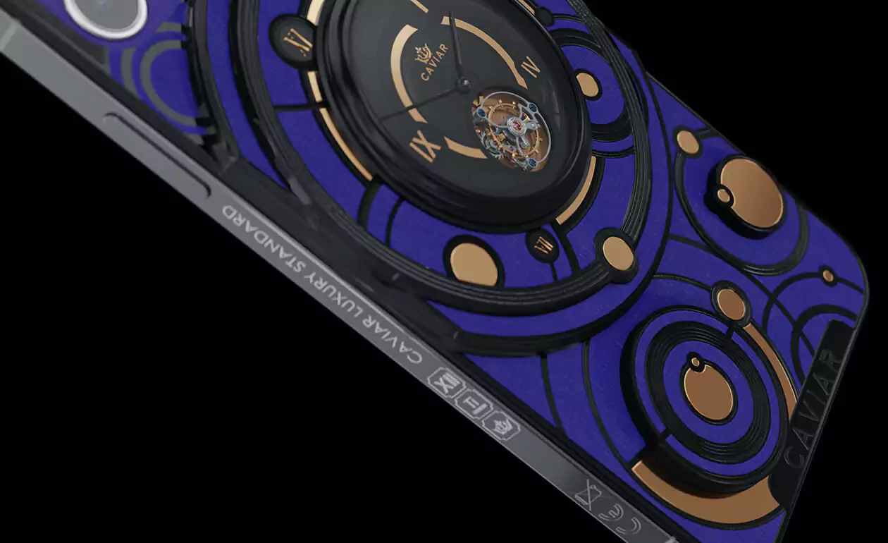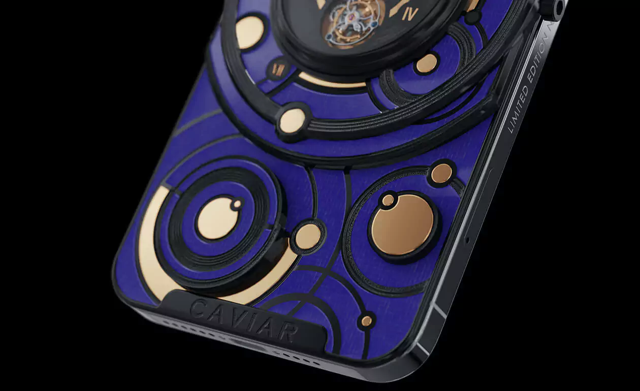The deep blue color of the body and the gold and black decorative elements form the new look of the smartphone with the Caviar tourbillon.