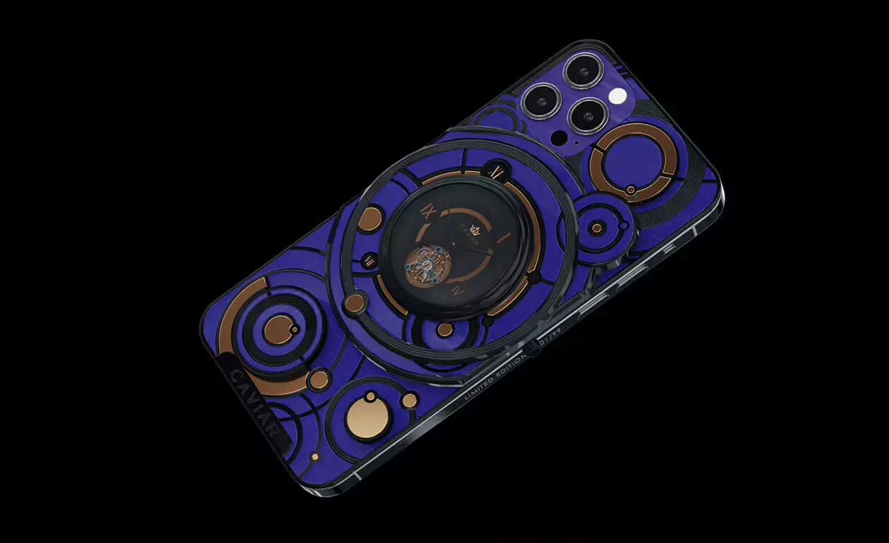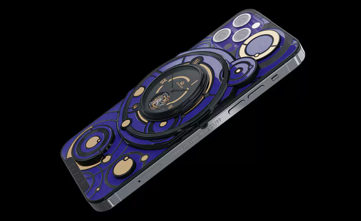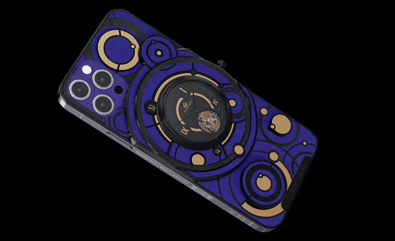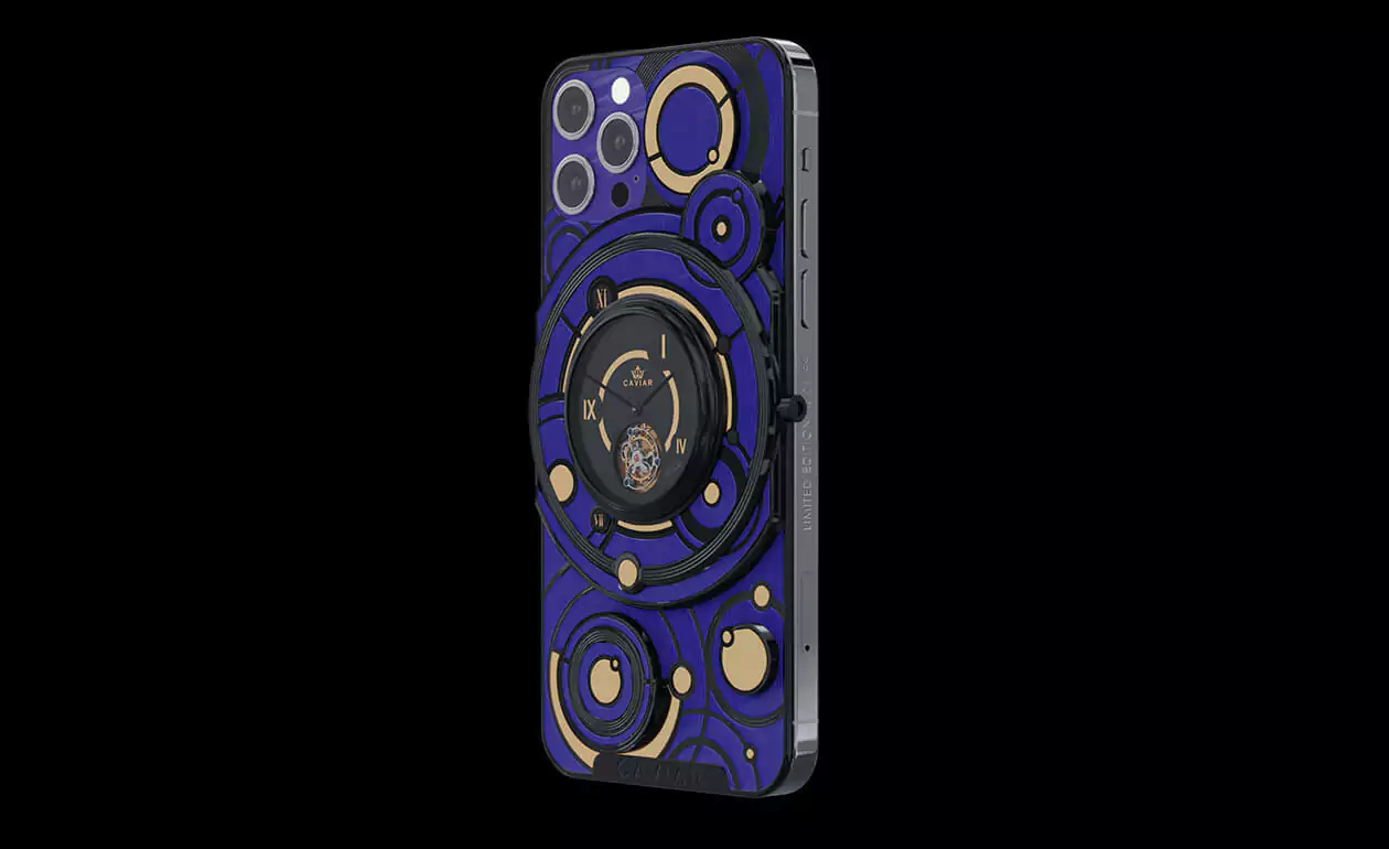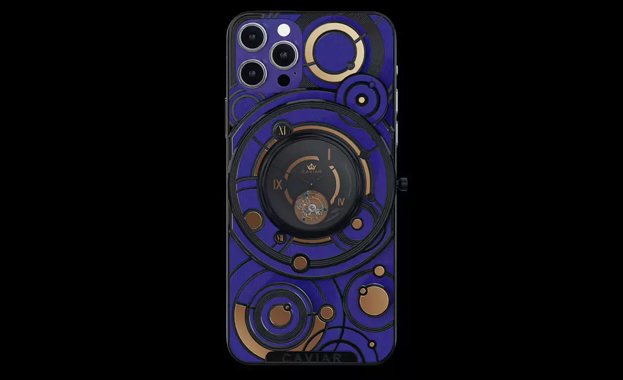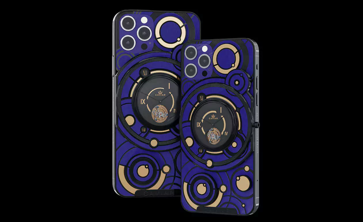 The deep blue color of the body and the gold and black decorative elements form the new look of the smartphone with the Caviar tourbillon.