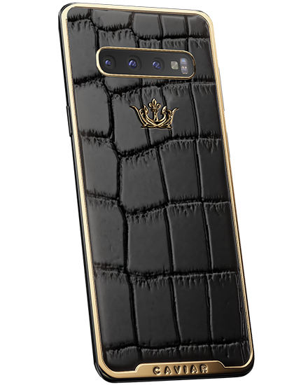 In the design of the phone Caviar Classic Corona Alligatore, the natural black alligator leather and refined gold-plated accents in form of a plate with the brand name and emblem presenting a crown, have been combined into a convincing tandem. By the way, pay some attention to this element and you’ll see that the crown is literally built of several components – two royal sturgeons, rushing towards each other and the image of an anchor embodying the constancy and stability.