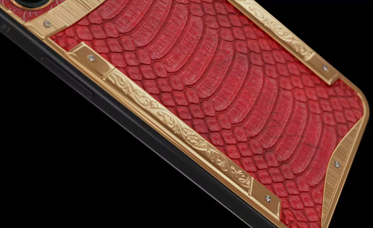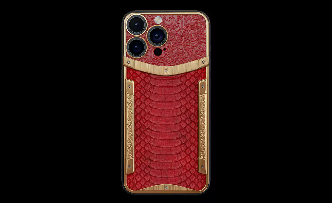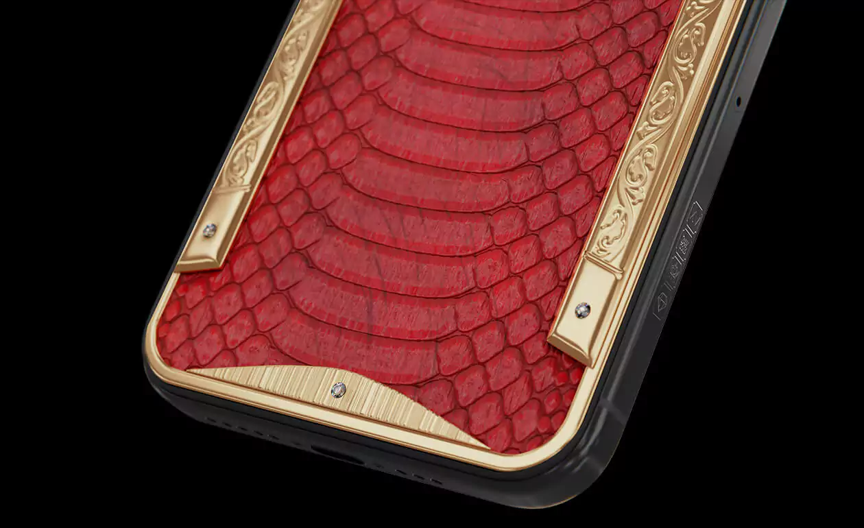 Back panel: Double gold covering according to the technology Double Electroplated (999 content, 7 microns). Genuine python leather of red color.