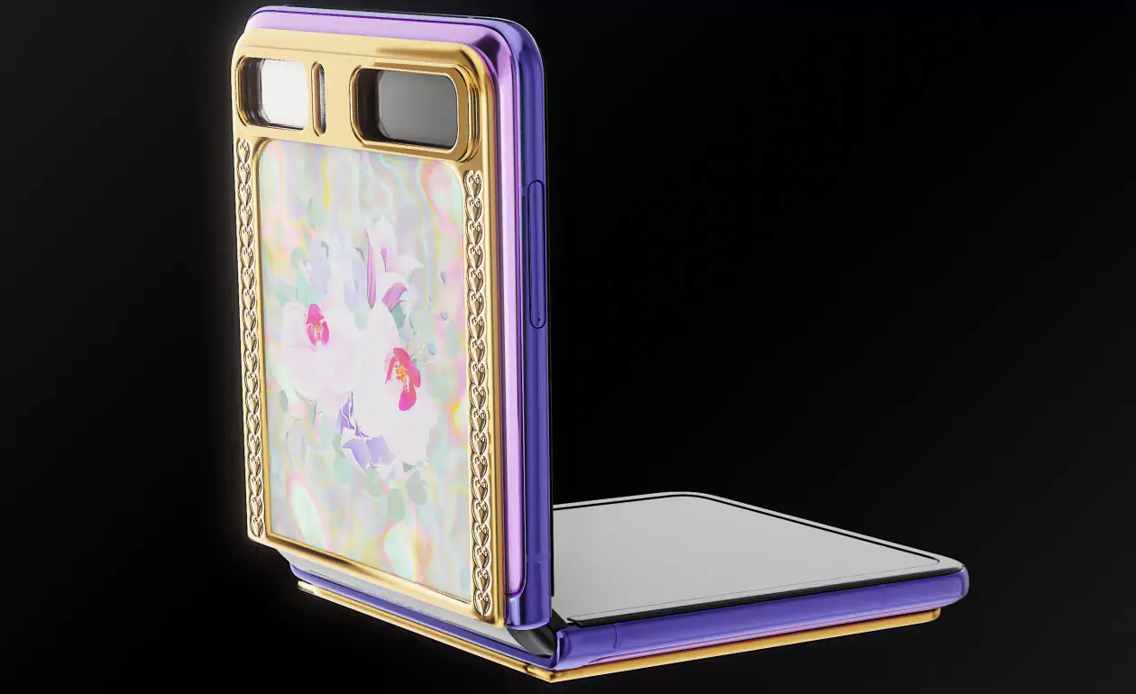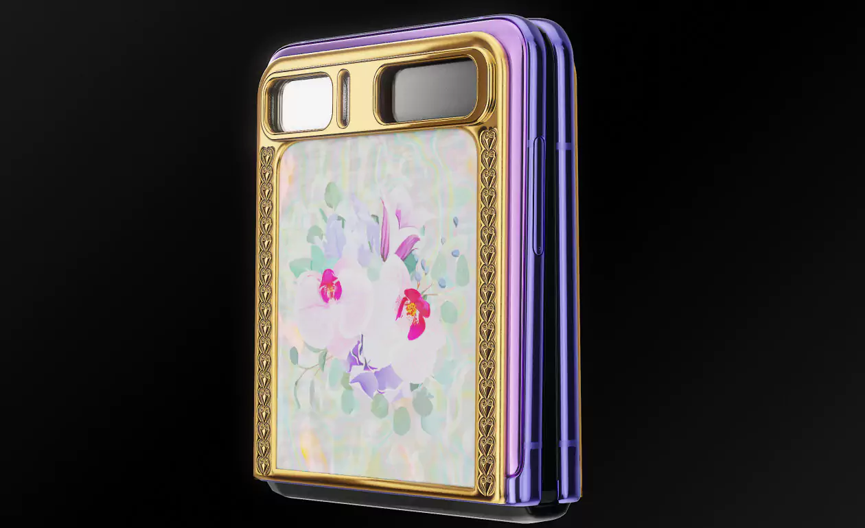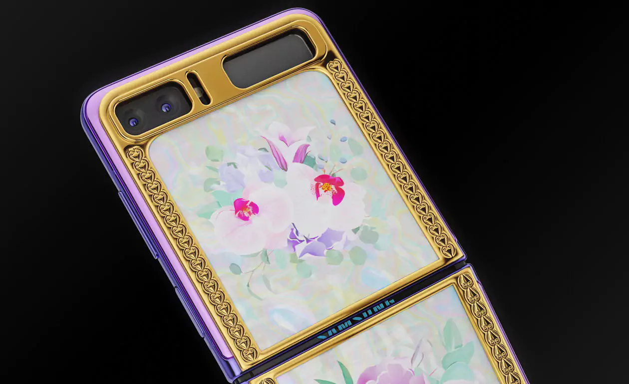 A delicate, seductive, passionate orchid dominates the luxurious bouquet of flowers that adorns the stylish Samsung Galaxy Z Flip.