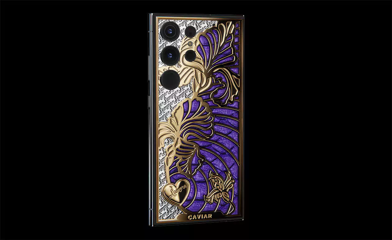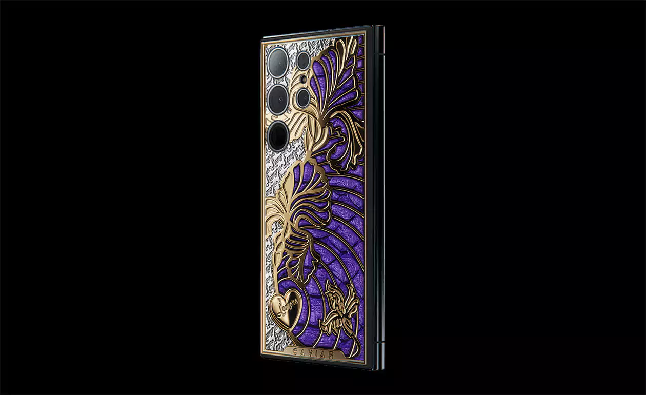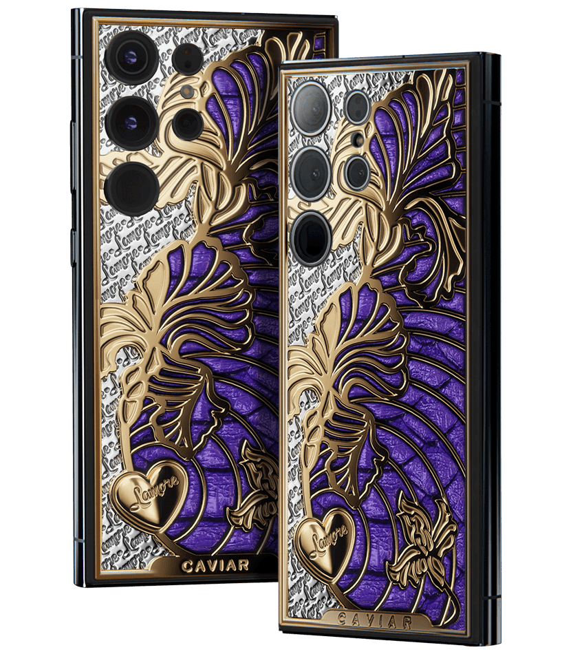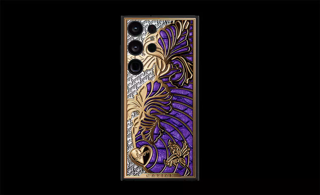 iris is a smartphone with a captivating touch of symbolism. The voluminous iris flower pattern is coated with gold using the Double Electroplated (24K) technology. The design is complemented by luxurious violet python leather of Italian craftsmanship.