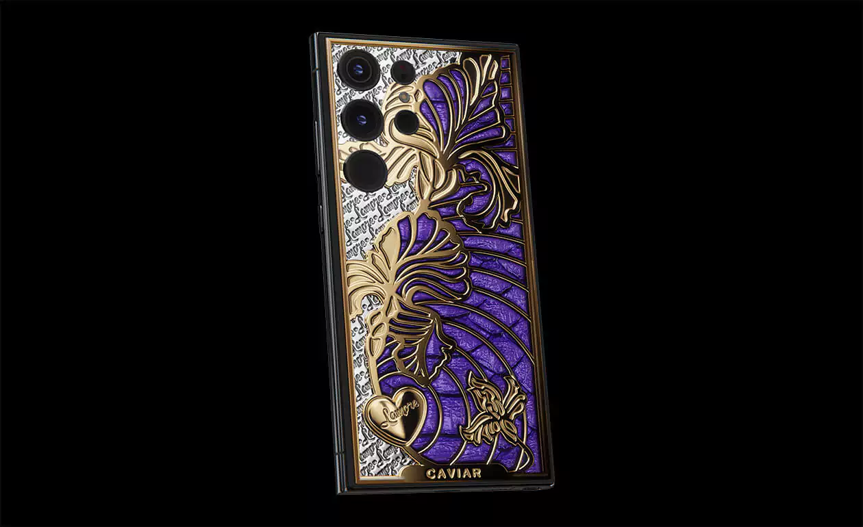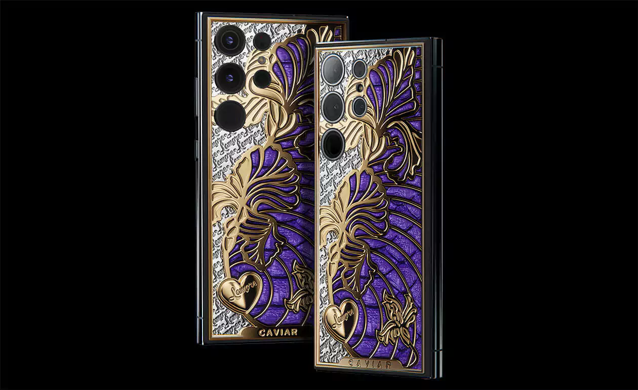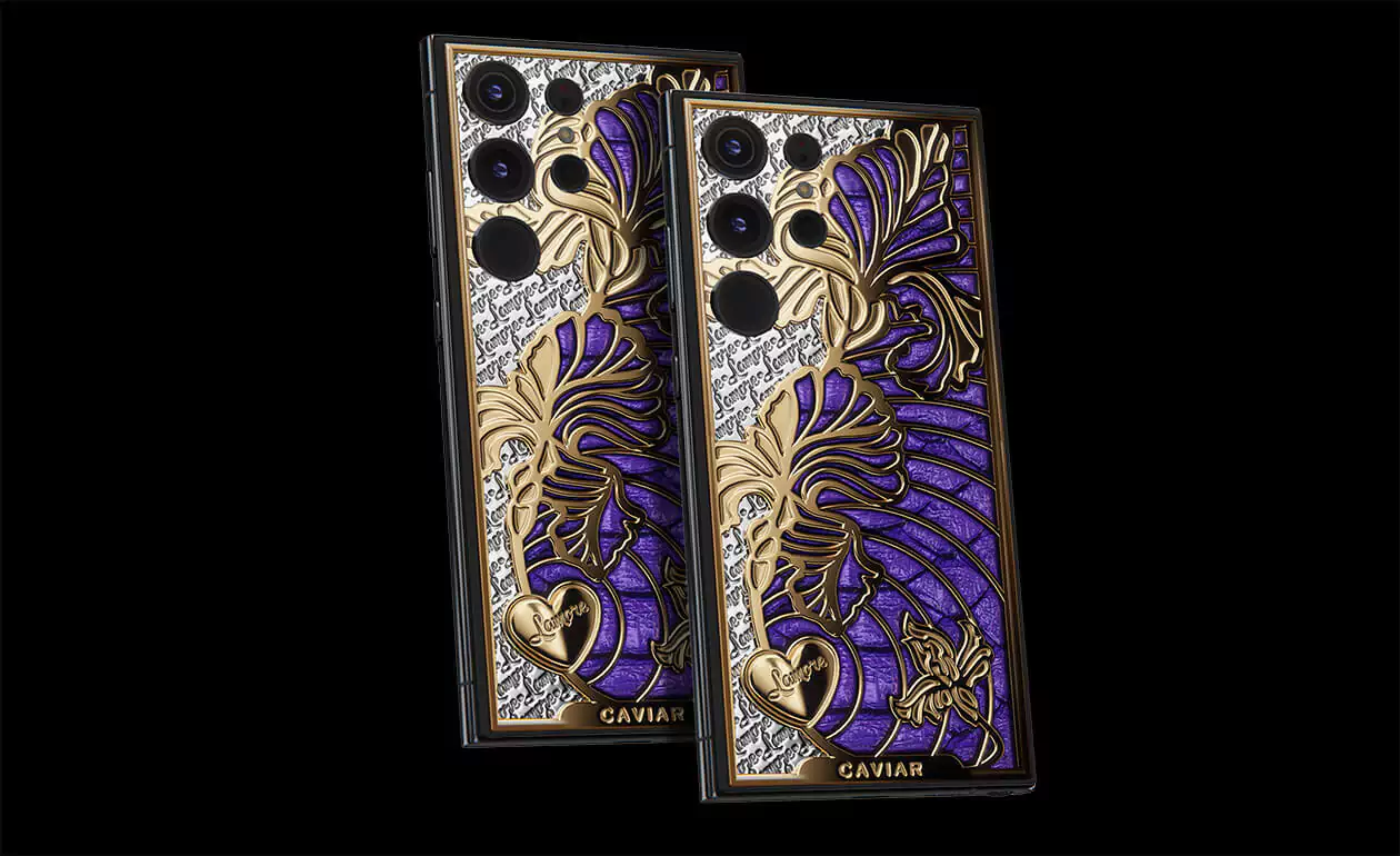 iris is a smartphone with a captivating touch of symbolism. The voluminous iris flower pattern is coated with gold using the Double Electroplated (24K) technology. The design is complemented by luxurious violet python leather of Italian craftsmanship.