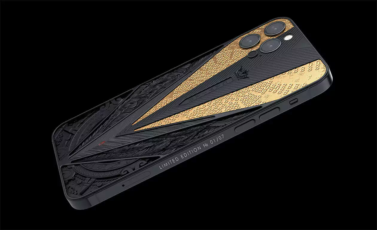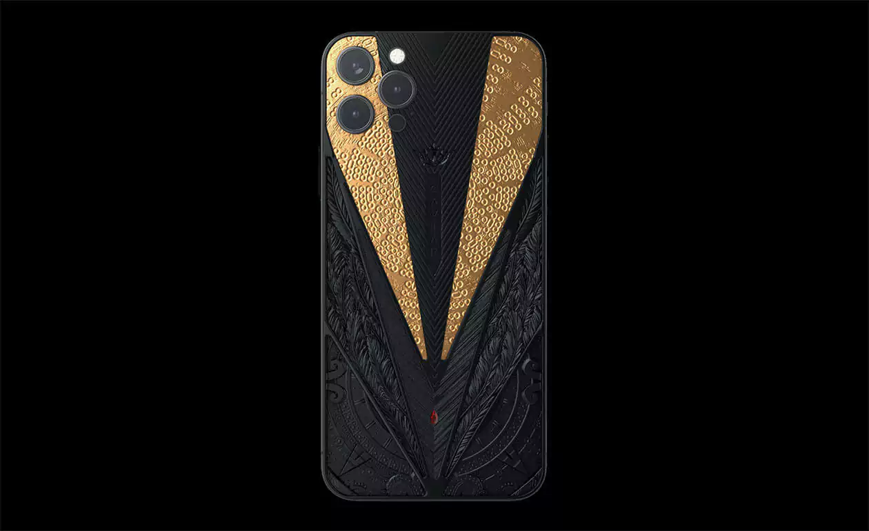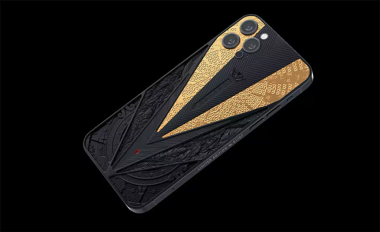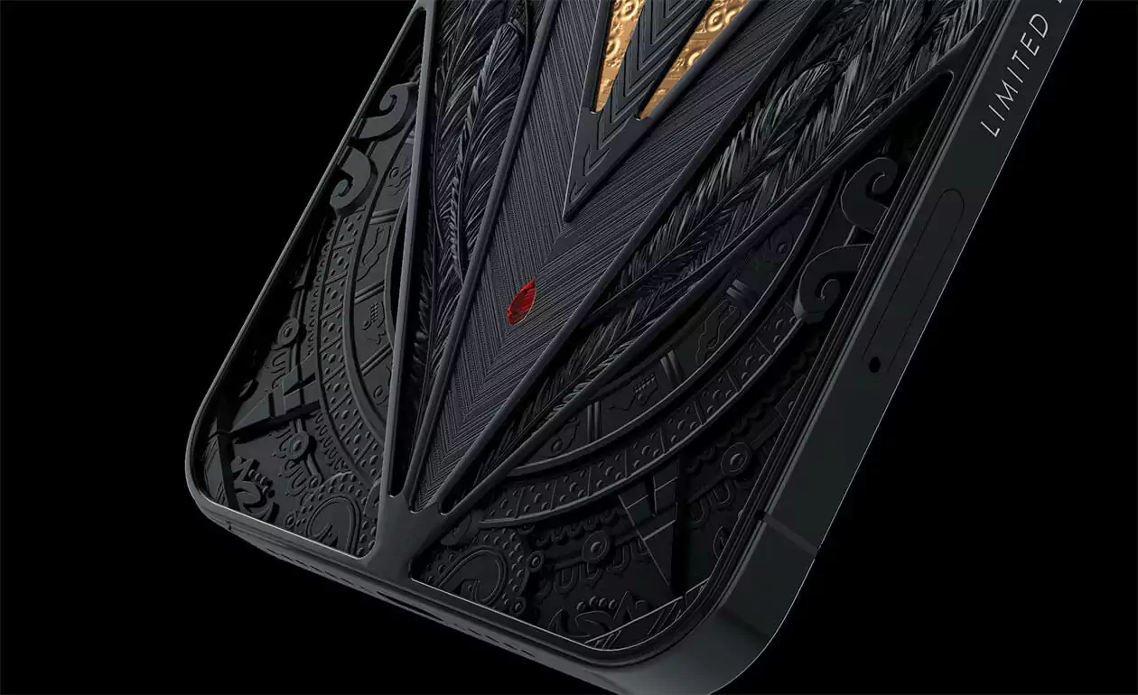 The smartphone is made of titanium with a black super-strong PVD coating, used in the manufacturing of Swiss watches, with inserts of solid gold with a laser pattern. The centerpiece of the model is titanium with three-dimensional feathers and a Mayan calendar.