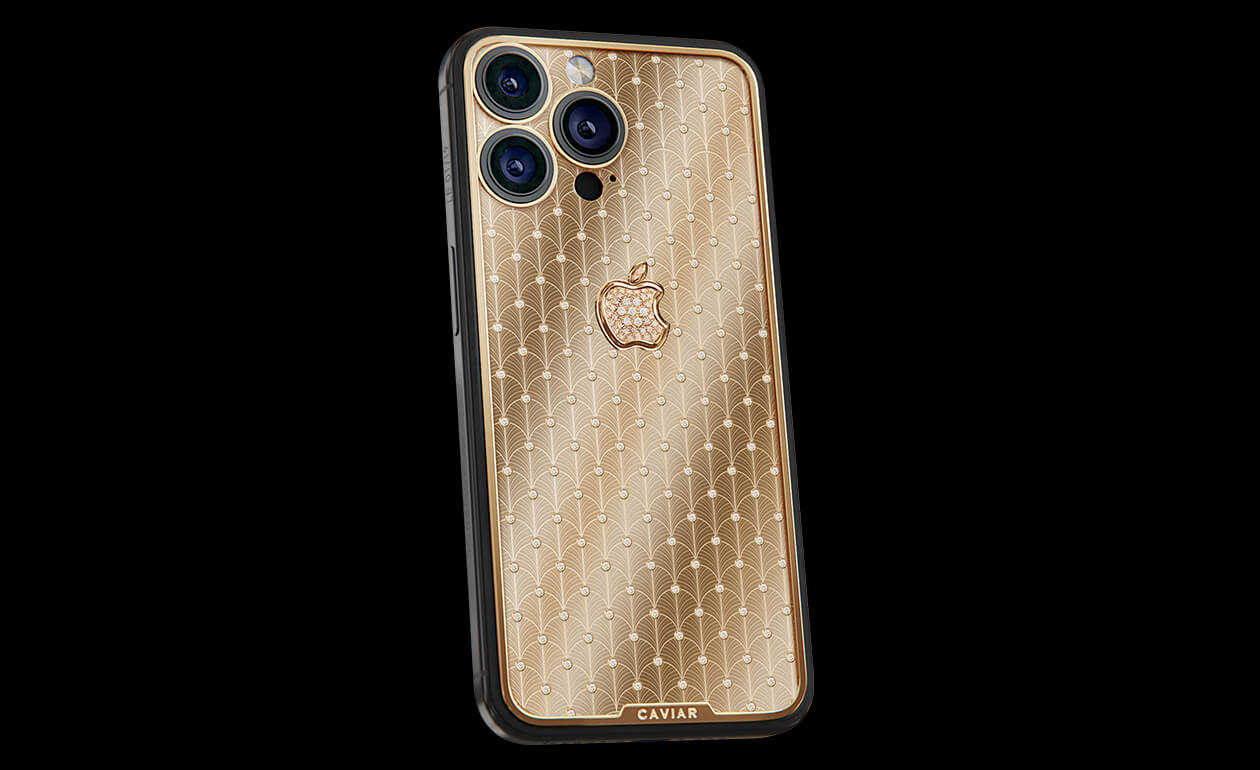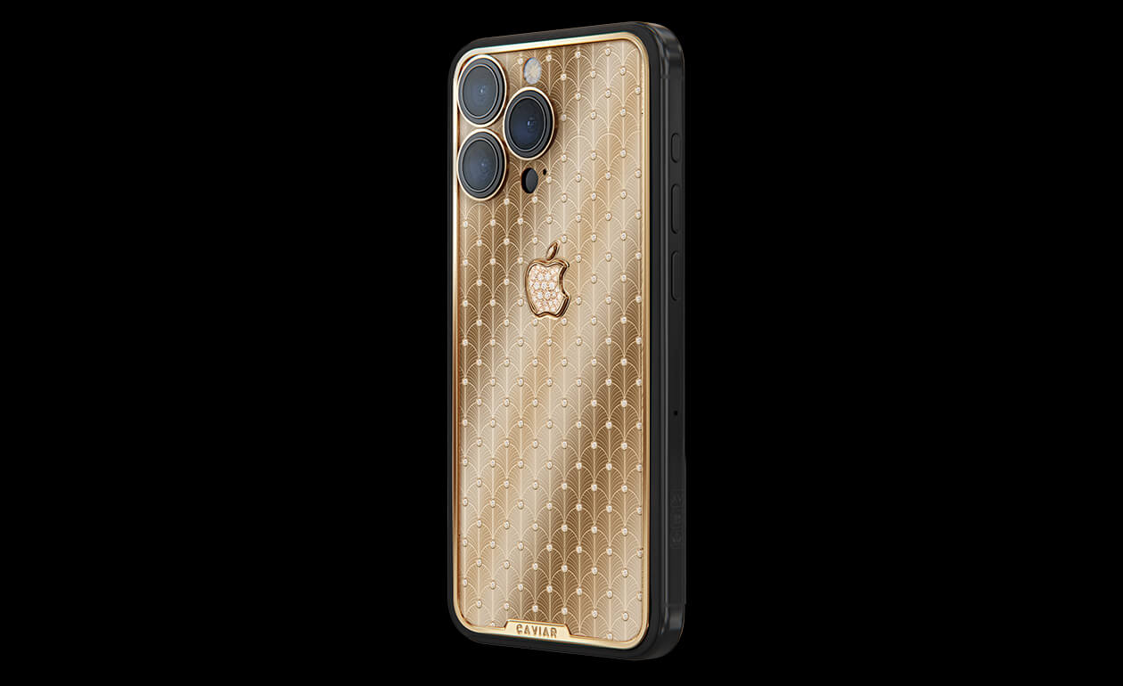 Tropical Art Deco patterns on the iPhone case. Elegant design, echoing the art of the modernist era. Palm leaves adorned the rich interiors of the aristocracy of the past century. Caviar covered the device's gold case with a magnificent ornament. Caviar's craftsmen complemented the golden splendor with a scattering of diamonds. In the center is a precious apple made of crystal mosaic.