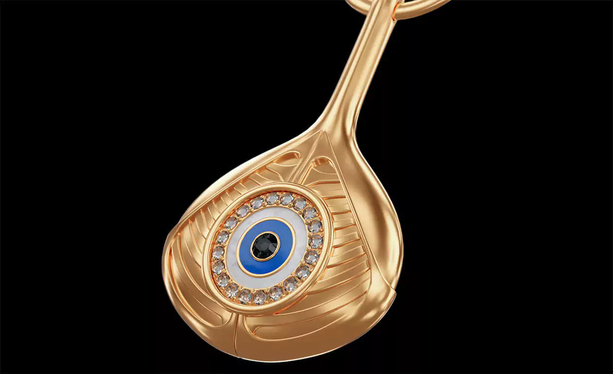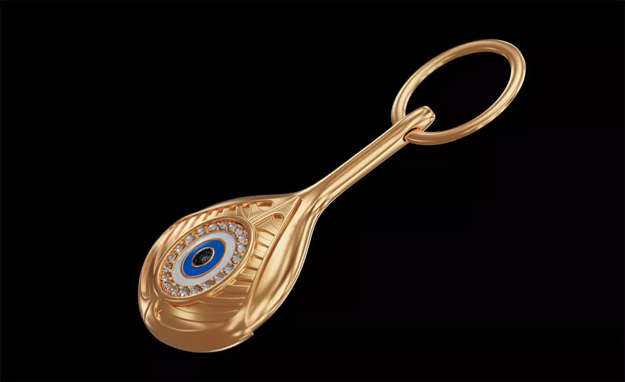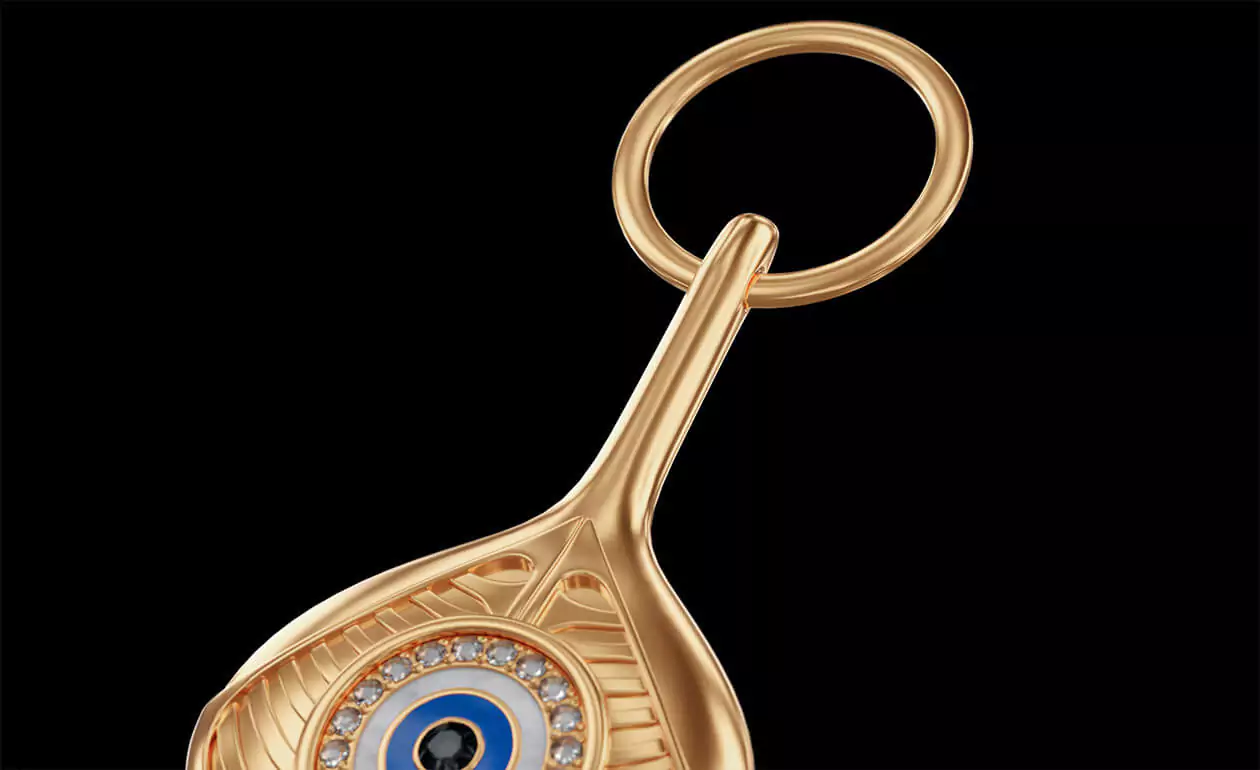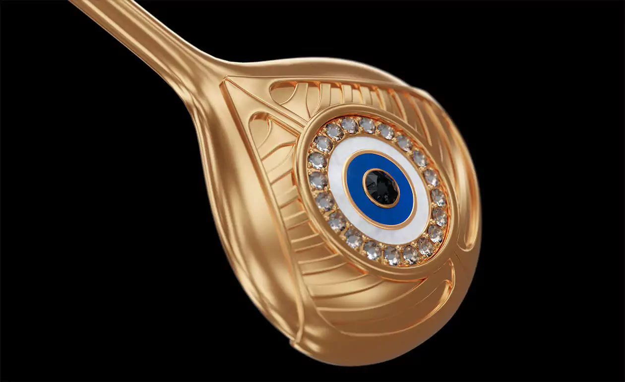 The 18k yellow gold case is engraved with falcon wings, a symbol of the UAE. In the center of the composition is a Fatima's Eye jewelry enameled with 20 brilliant diamonds, 1.2 mm in diameter. In the center of the charm is a large black diamond with a diameter of 3 mm.