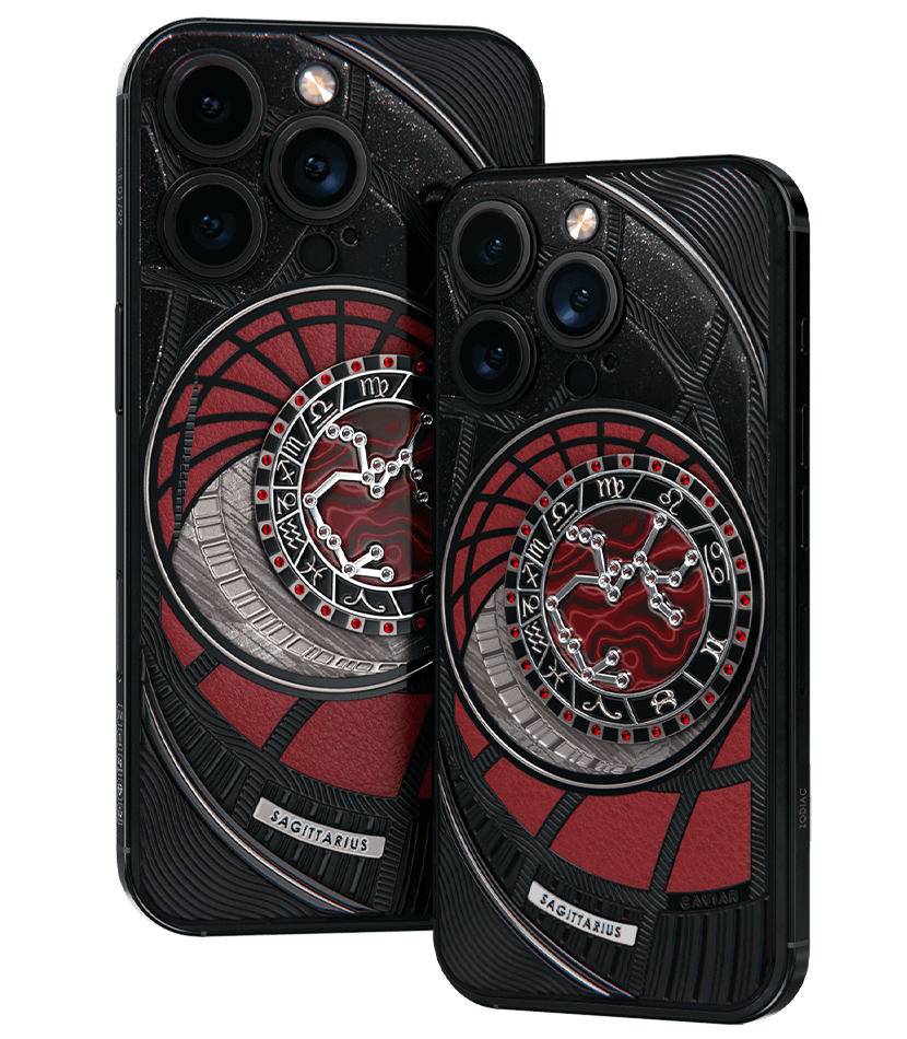 Sagittariuses, today we present to you Sagitarius. Your smartphone has a sky vault with your stars on it. This is a panel of 24 rubies, created on black titanium with a PVD coating. We emphasized the glow of the ruby placer with a plate of red composite and finished the composition with a fragment of a meteorite on calfskin in a bright carmine shade.