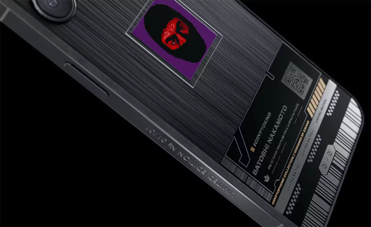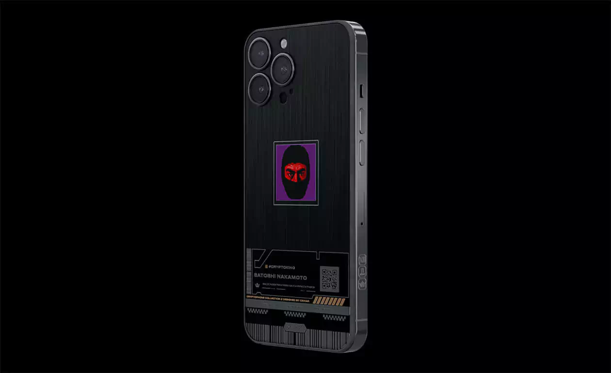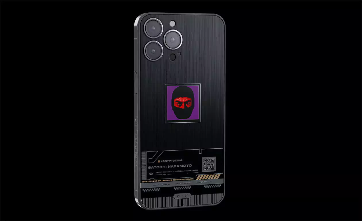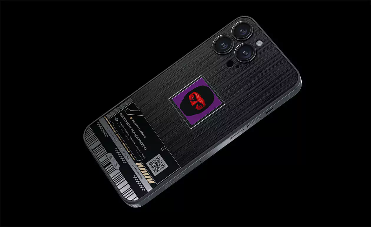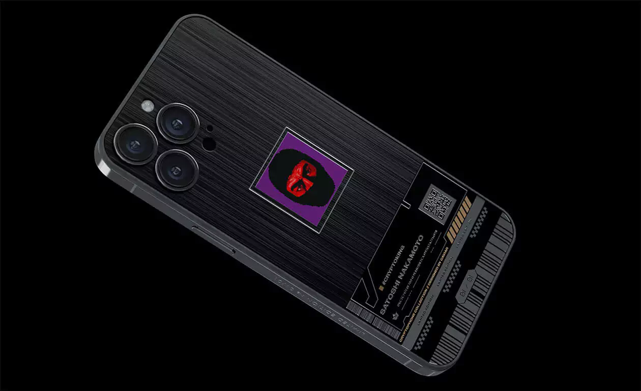 A pixel art portrait of Nakamoto - a mysterious ninja - adorns the titanium body of the phone. The lower part of the case body