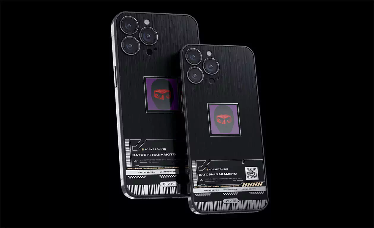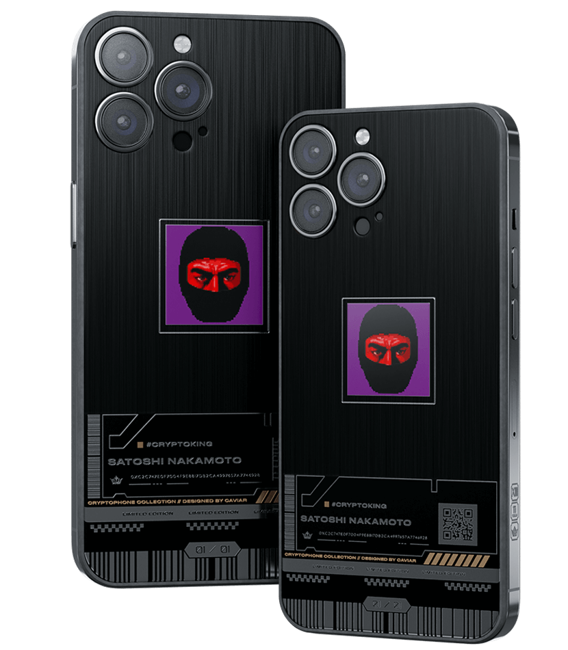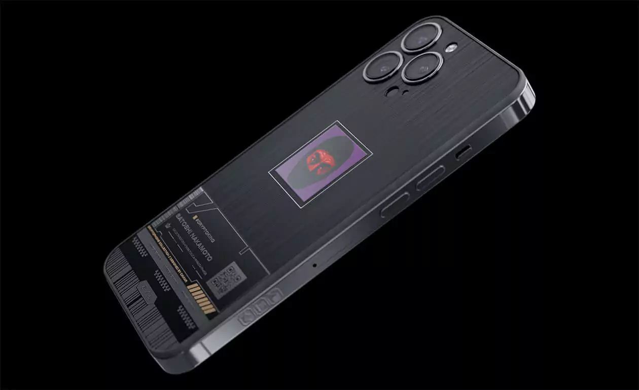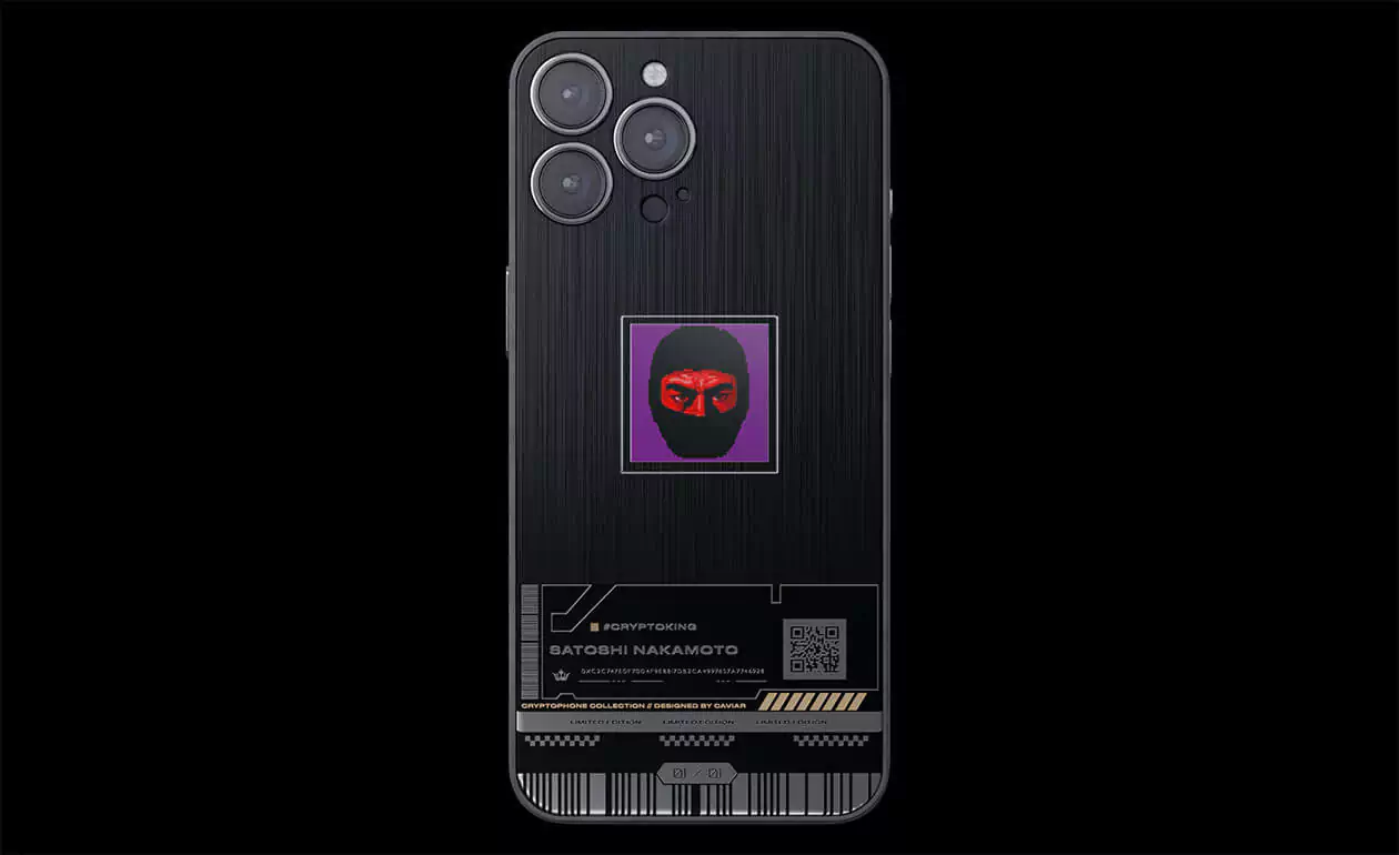 A pixel art portrait of Nakamoto - a mysterious ninja - adorns the titanium body of the phone. The lower part of the case body