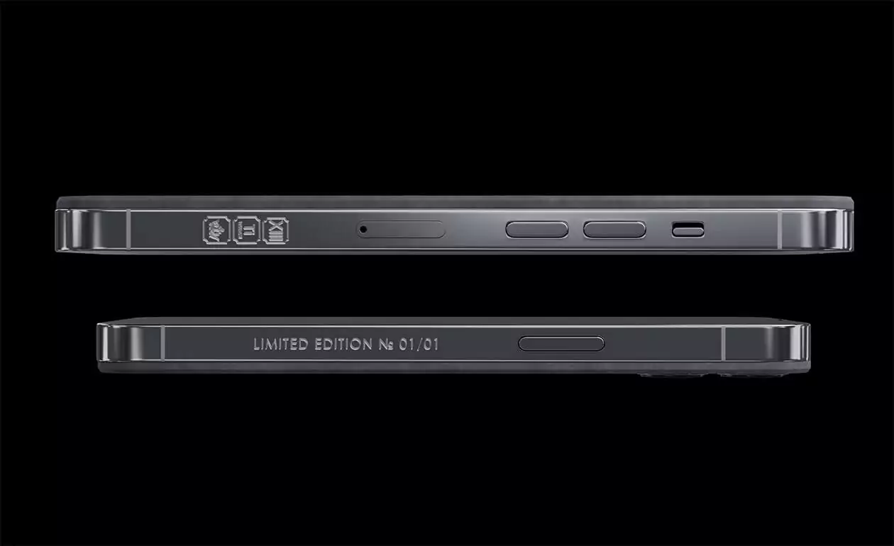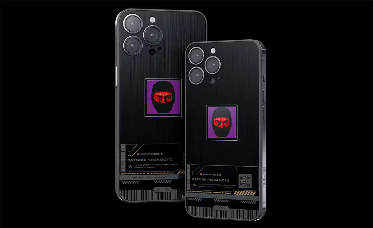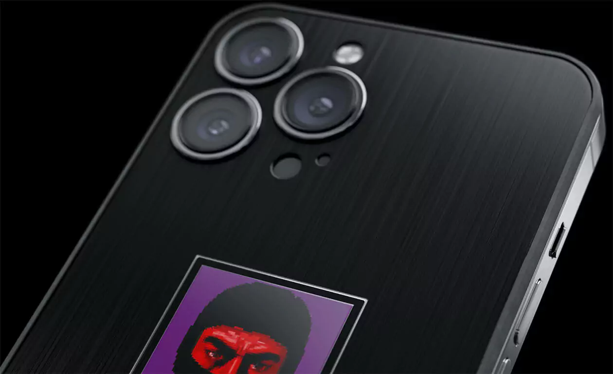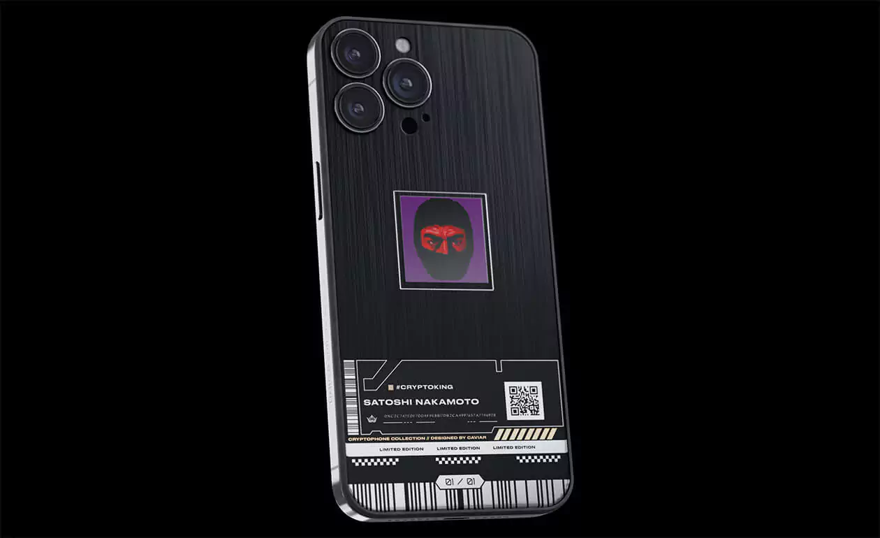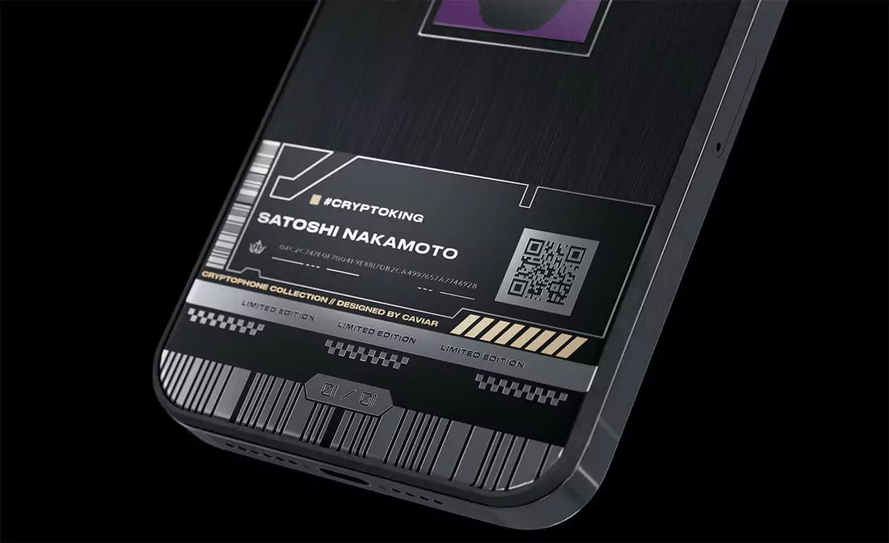 A pixel art portrait of Nakamoto - a mysterious ninja - adorns the titanium body of the phone. The lower part of the case body