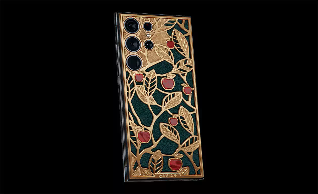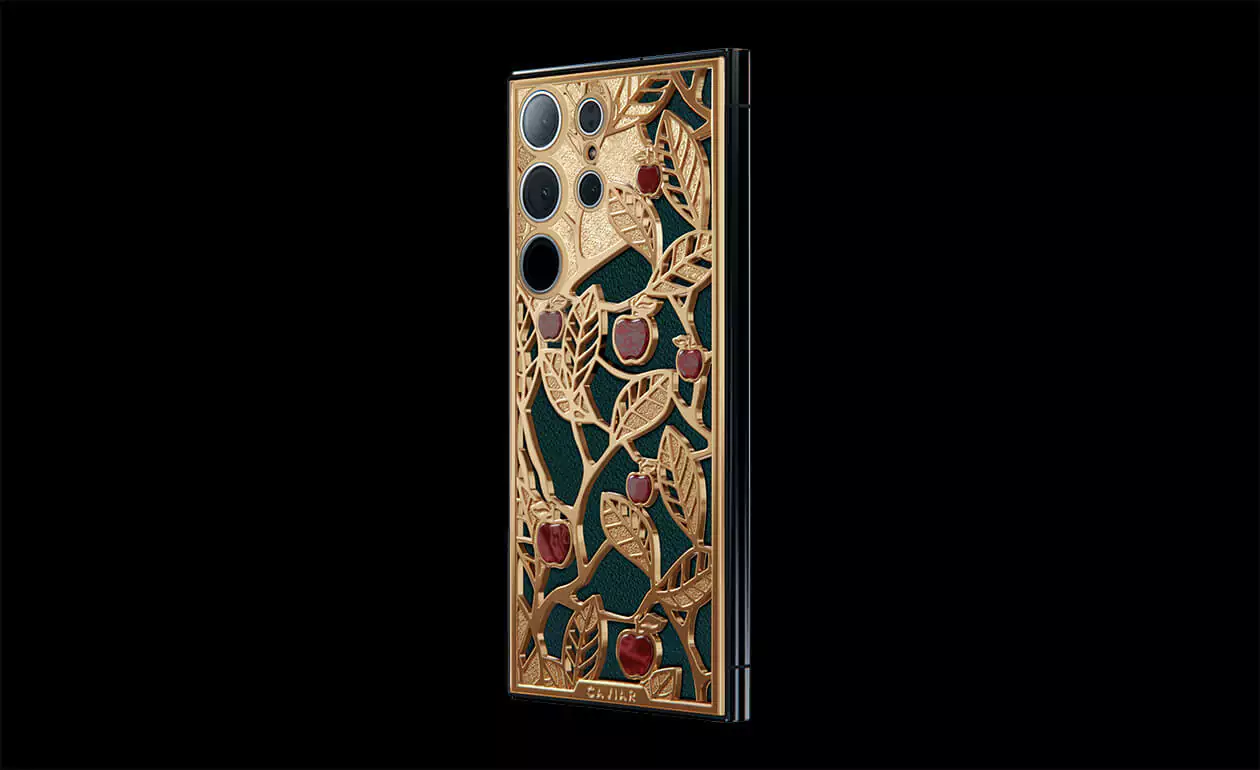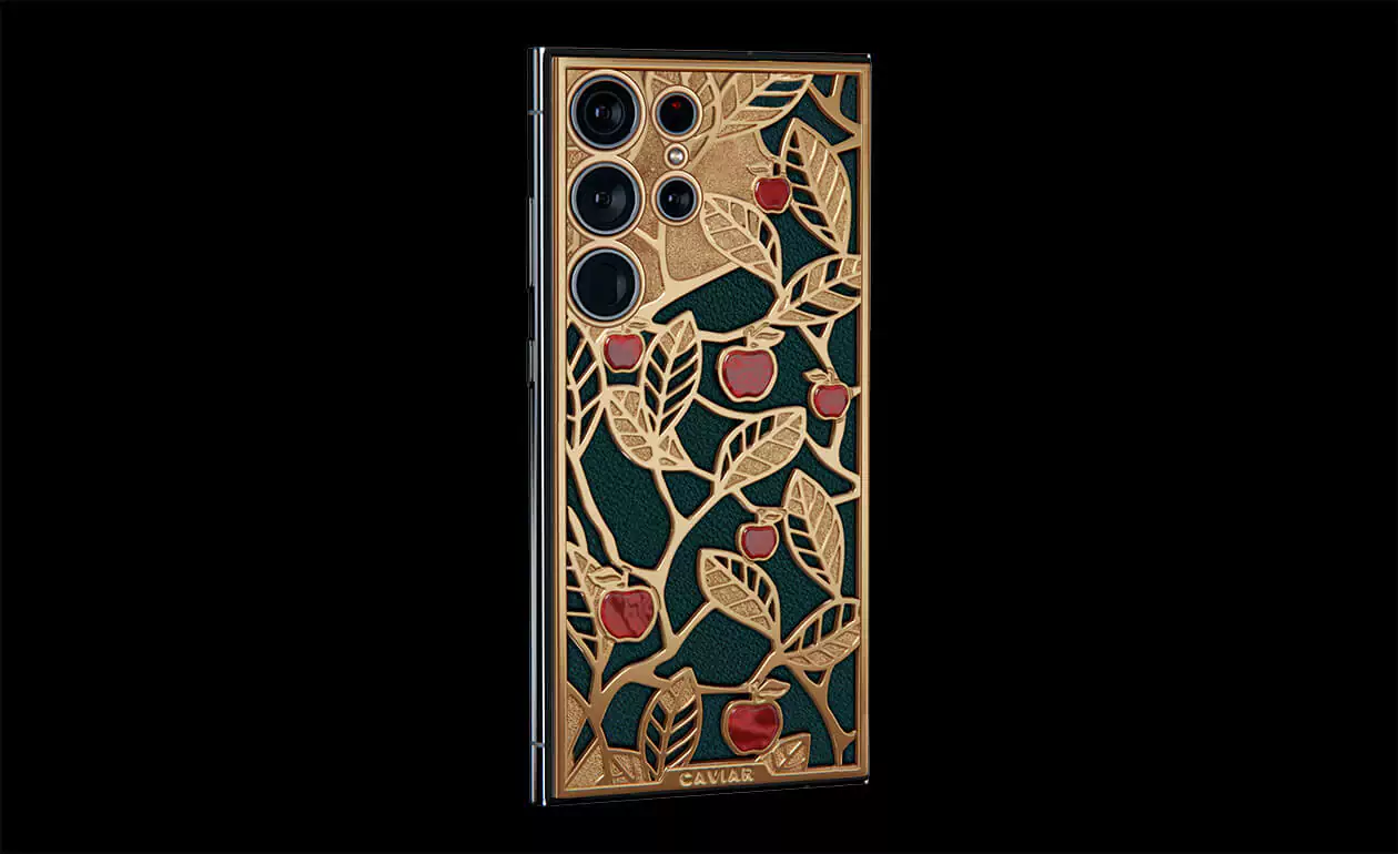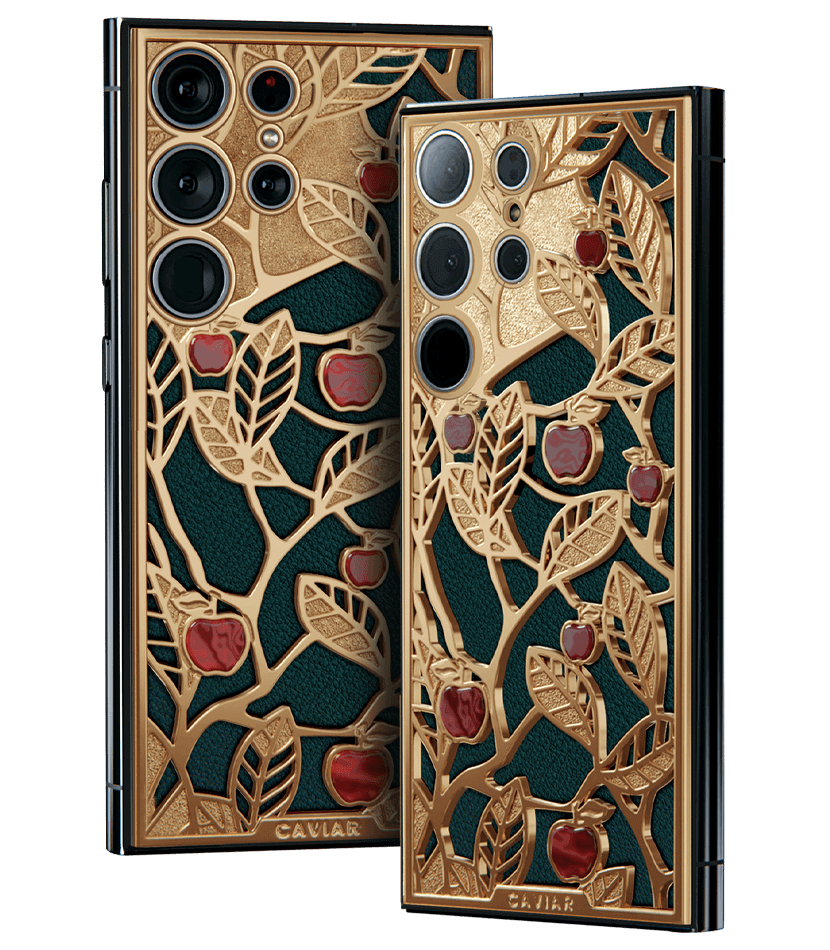 Golden apples are an ancient symbol of youth, wealth, and prosperity. A jewelry talisman adorned with apples attracts financial well-being, abundance, and prosperity. That's why the craftsmen at Caviar have placed them on the body of the most advanced Samsung. Caviar's Gold Apples shine thanks to the contrasting combination of emerald calf leather and lacy leaves covered in 24-karat gold. Gold Apples is an elegant smartphone for those accustomed to having all their wishes come true.