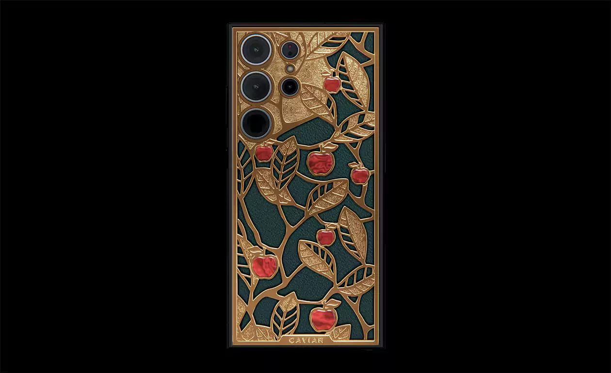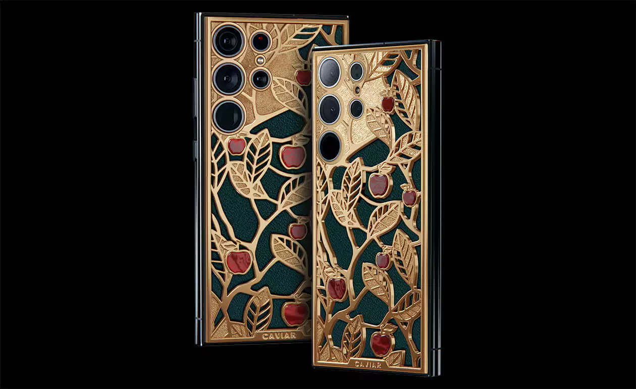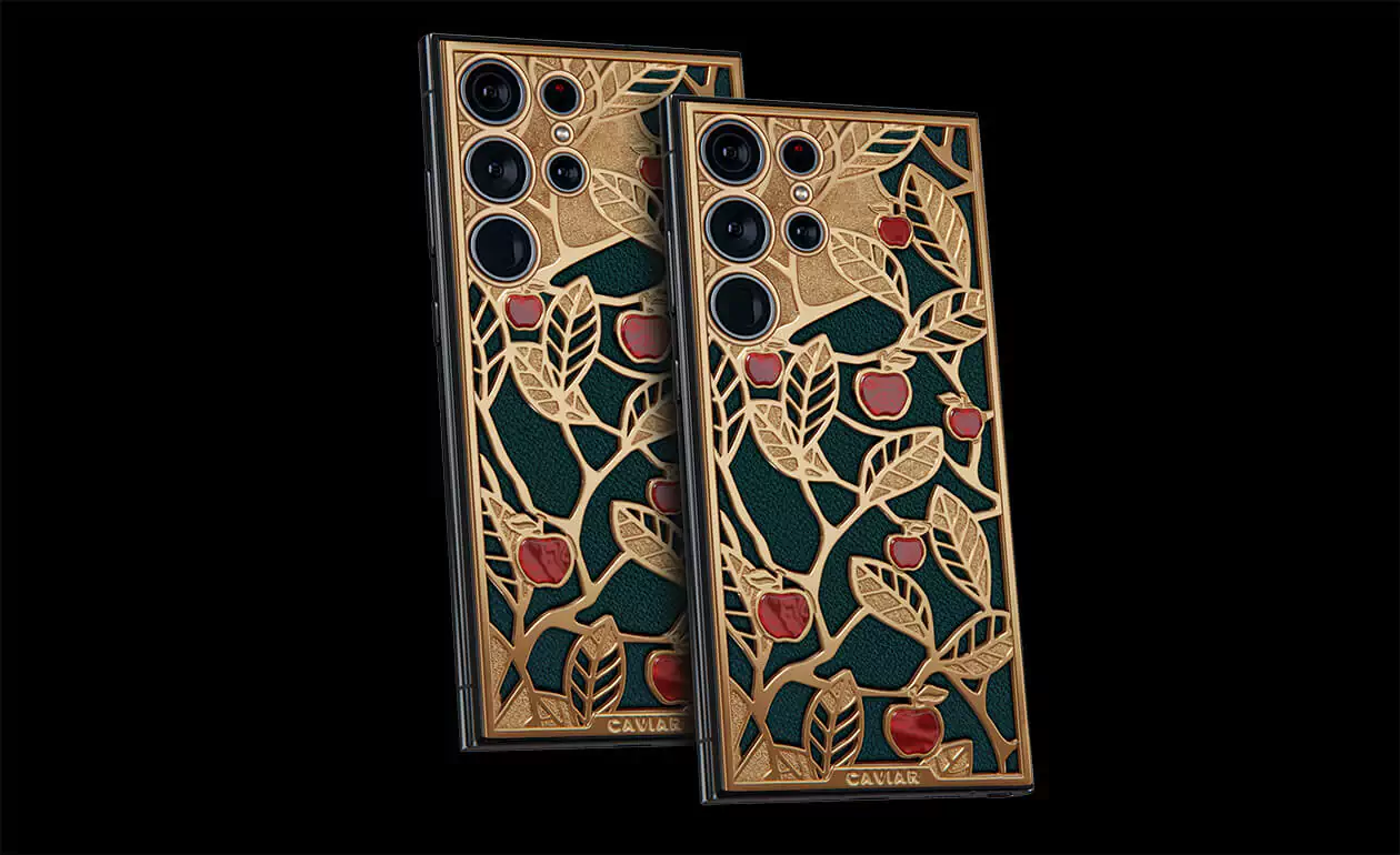 Golden apples are an ancient symbol of youth, wealth, and prosperity. A jewelry talisman adorned with apples attracts financial well-being, abundance, and prosperity. That's why the craftsmen at Caviar have placed them on the body of the most advanced Samsung. Caviar's Gold Apples shine thanks to the contrasting combination of emerald calf leather and lacy leaves covered in 24-karat gold. Gold Apples is an elegant smartphone for those accustomed to having all their wishes come true.
