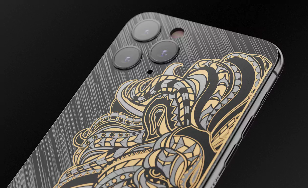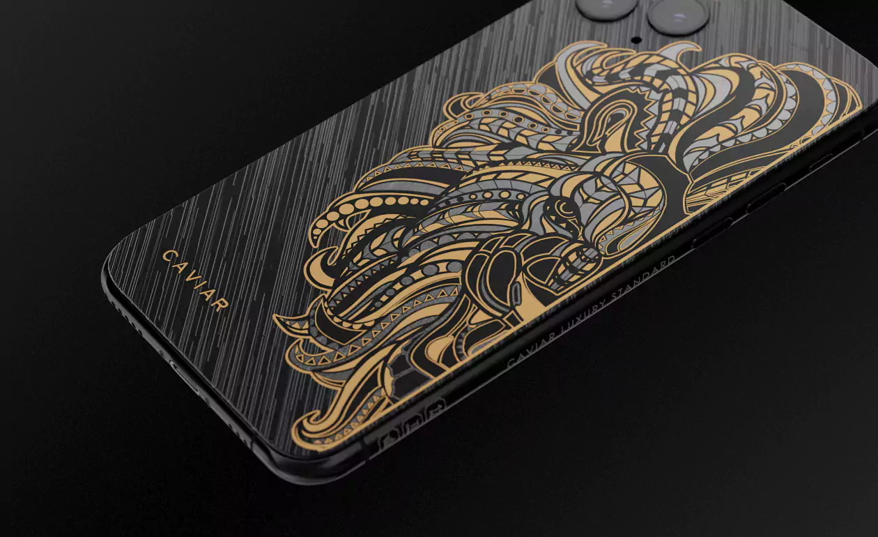 The body of the iPhone 14 Prois made of titanium with black PVD covering and decorated with staining. The image of the lion with a terrifying grin is made in the laser engraving technique on metal.