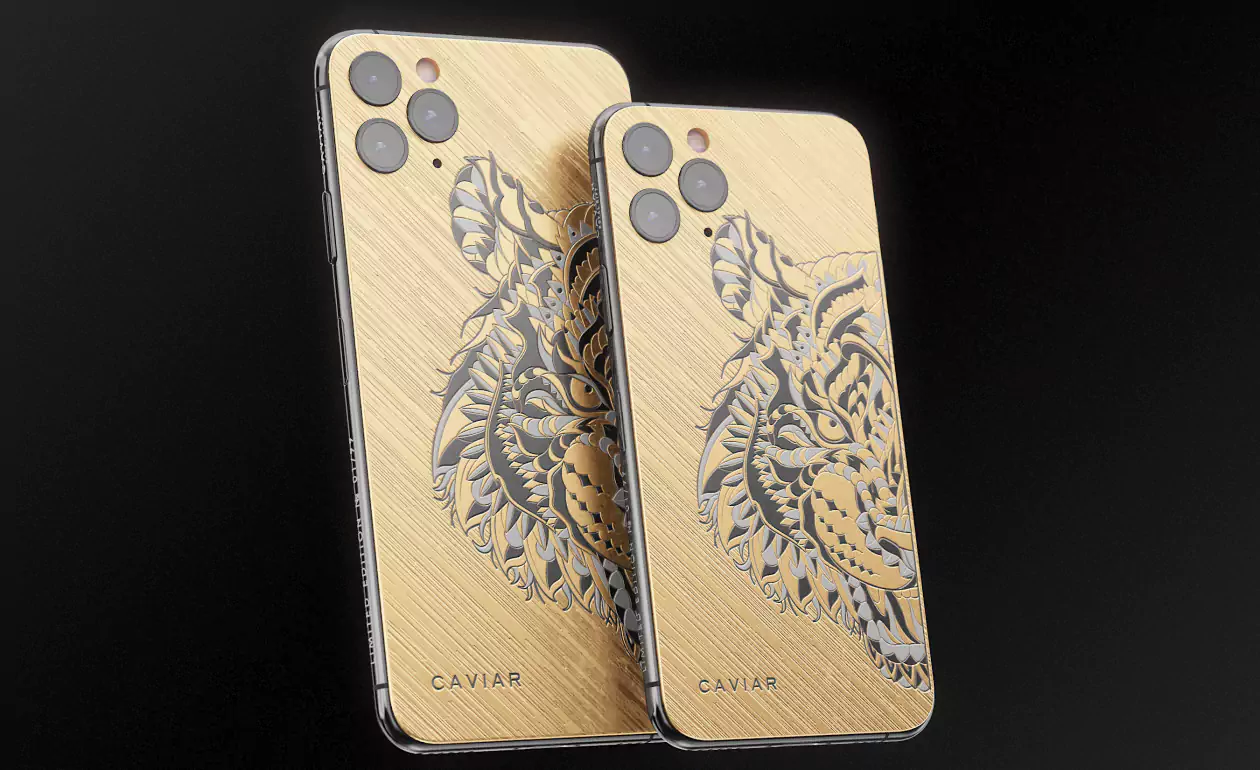 The body of the iPhone 11 Pro is made of titanium with gold PVD covering and decorated with staining. The image of a tiger with a terrifying grin is made in the laser engraving technique on metal.