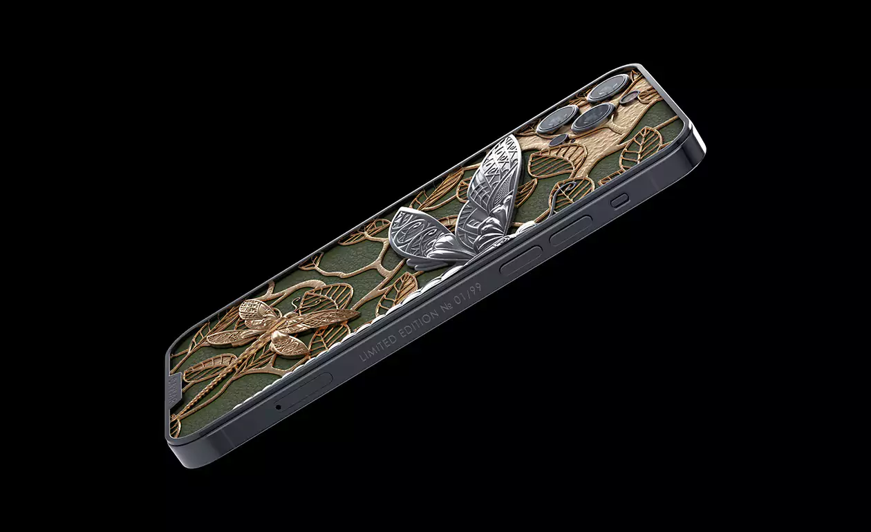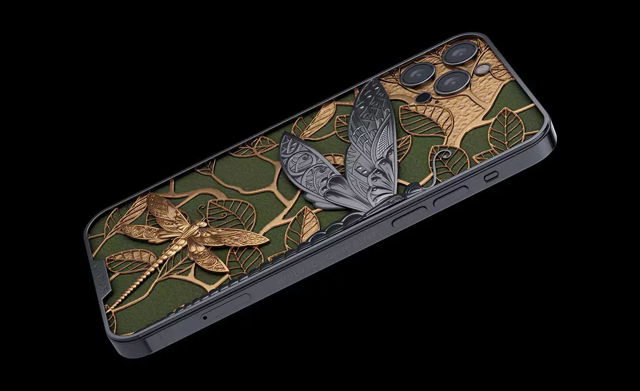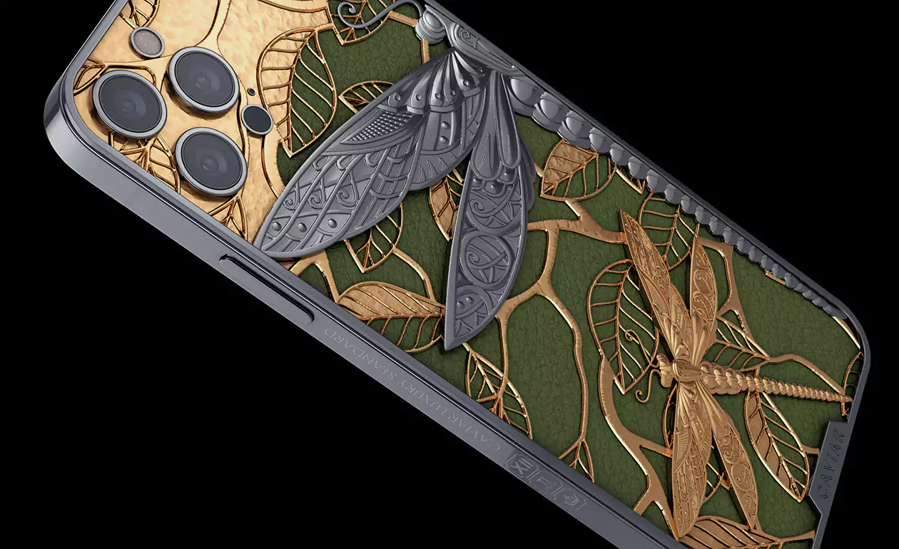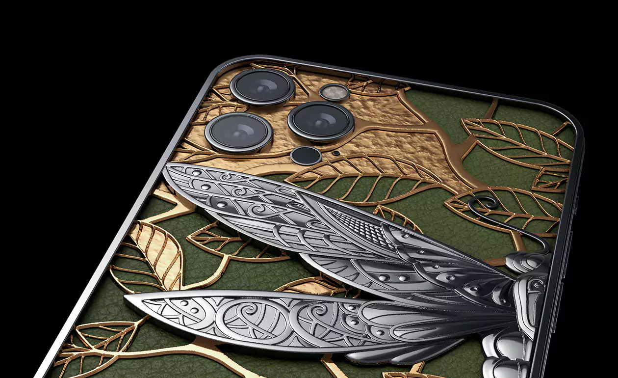 The dragonfly is a symbol of courage, energy and good luck. Most of all, this symbol is revered in Japan. In ancient times, before an important battle, the Japanese sacrificed dragonflies to the gods, asking for good luck in battle and victory over enemies. The beauty of the dragonfly captivated Caviar jewelers and inspired to create the iPhone 13 Pro Dragonfly.