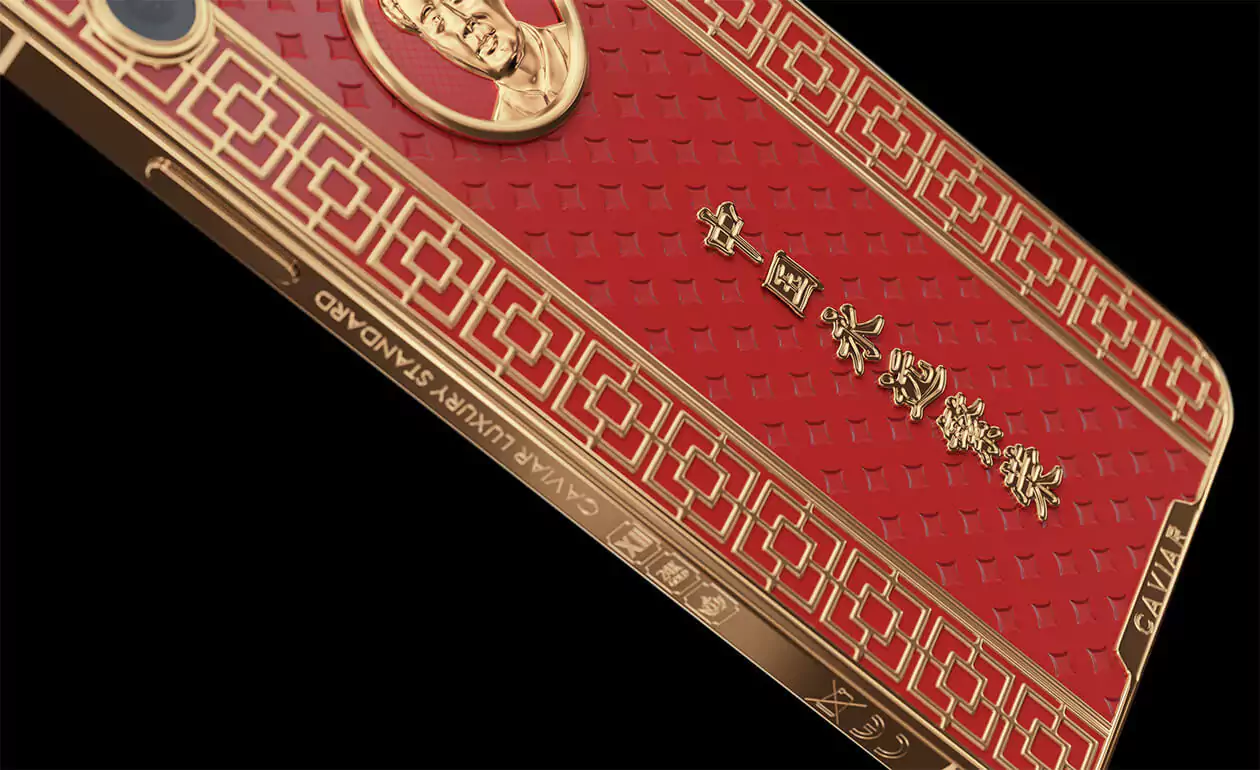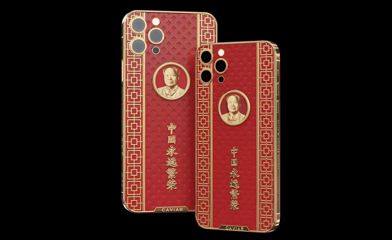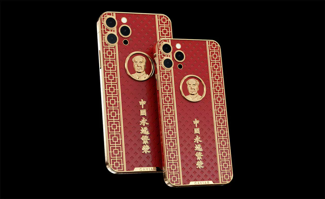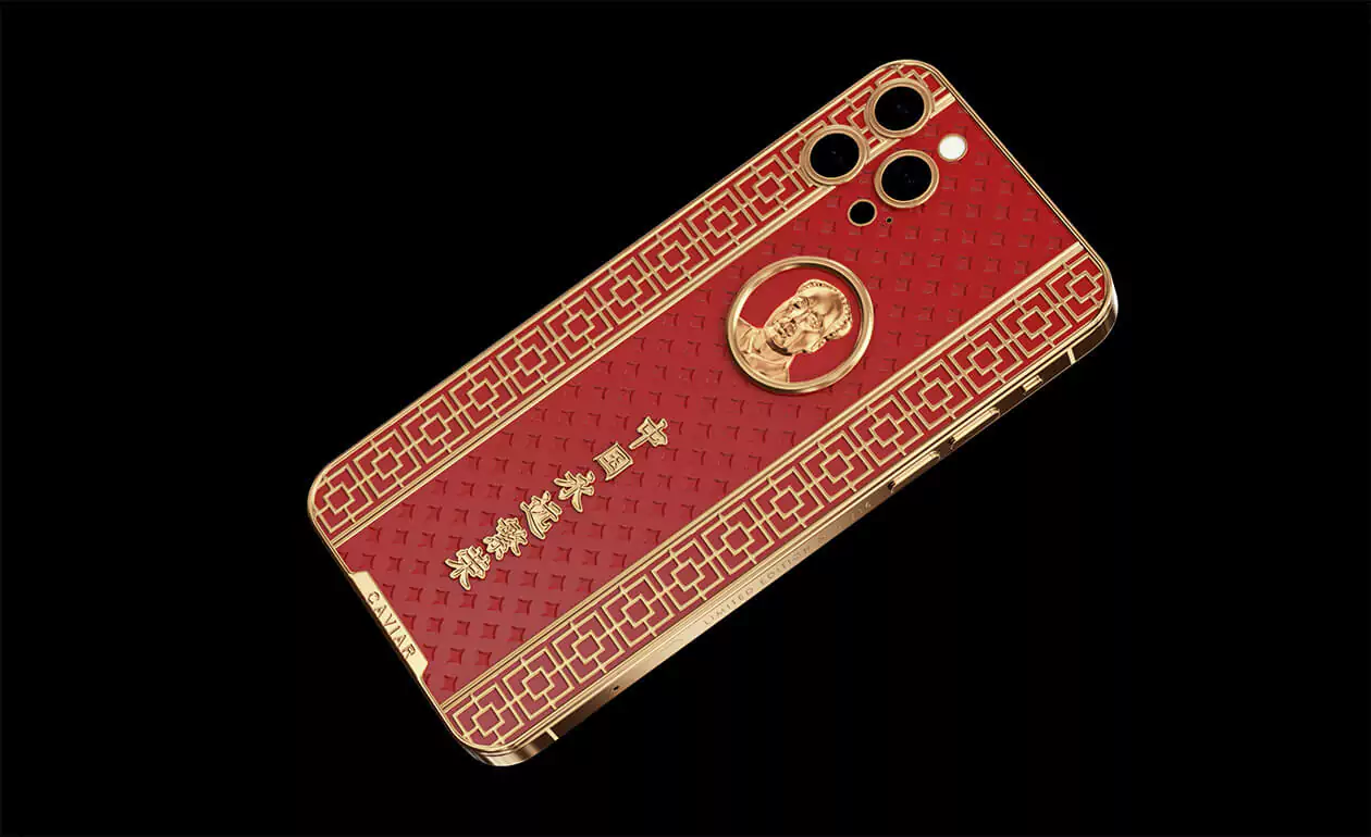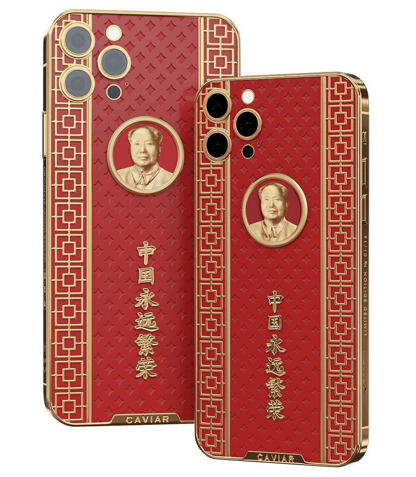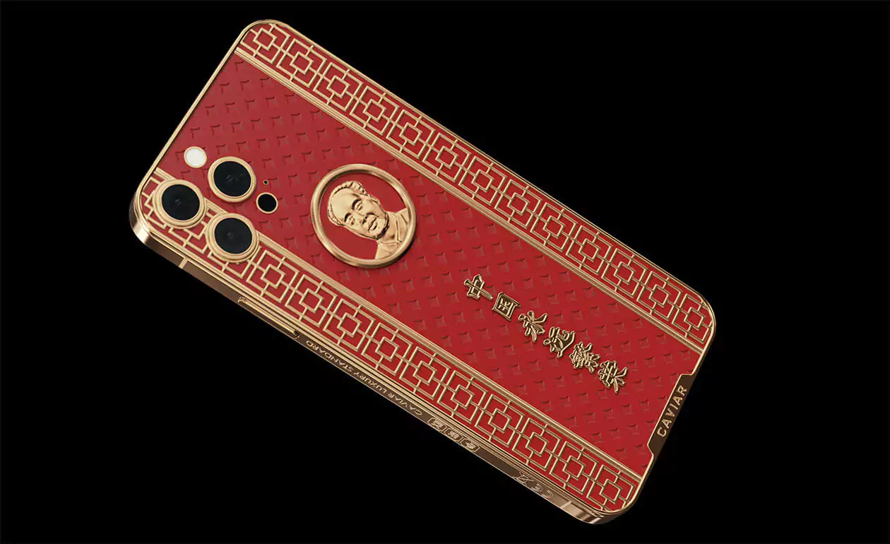 Caviar iPhone 12 Pro Mao Zedong is a smartphone design dedicated to the great politician. The case is made of red composite stone and decorated with a relief art engraving. In the center of the composition is a portrait of Mao Zedong made of 18-carat gold. National Chinese geometric ornaments are used in the decor. Inscribed in real gold: ""Eternally prosperous China.""
