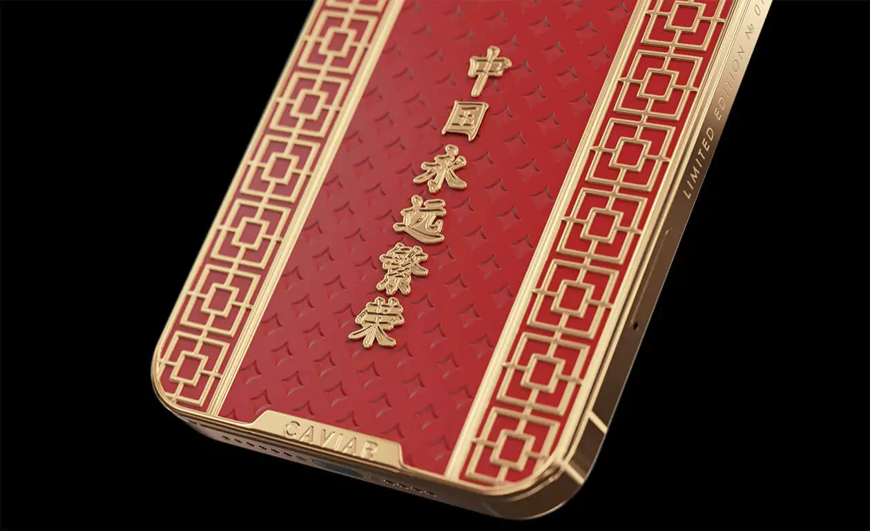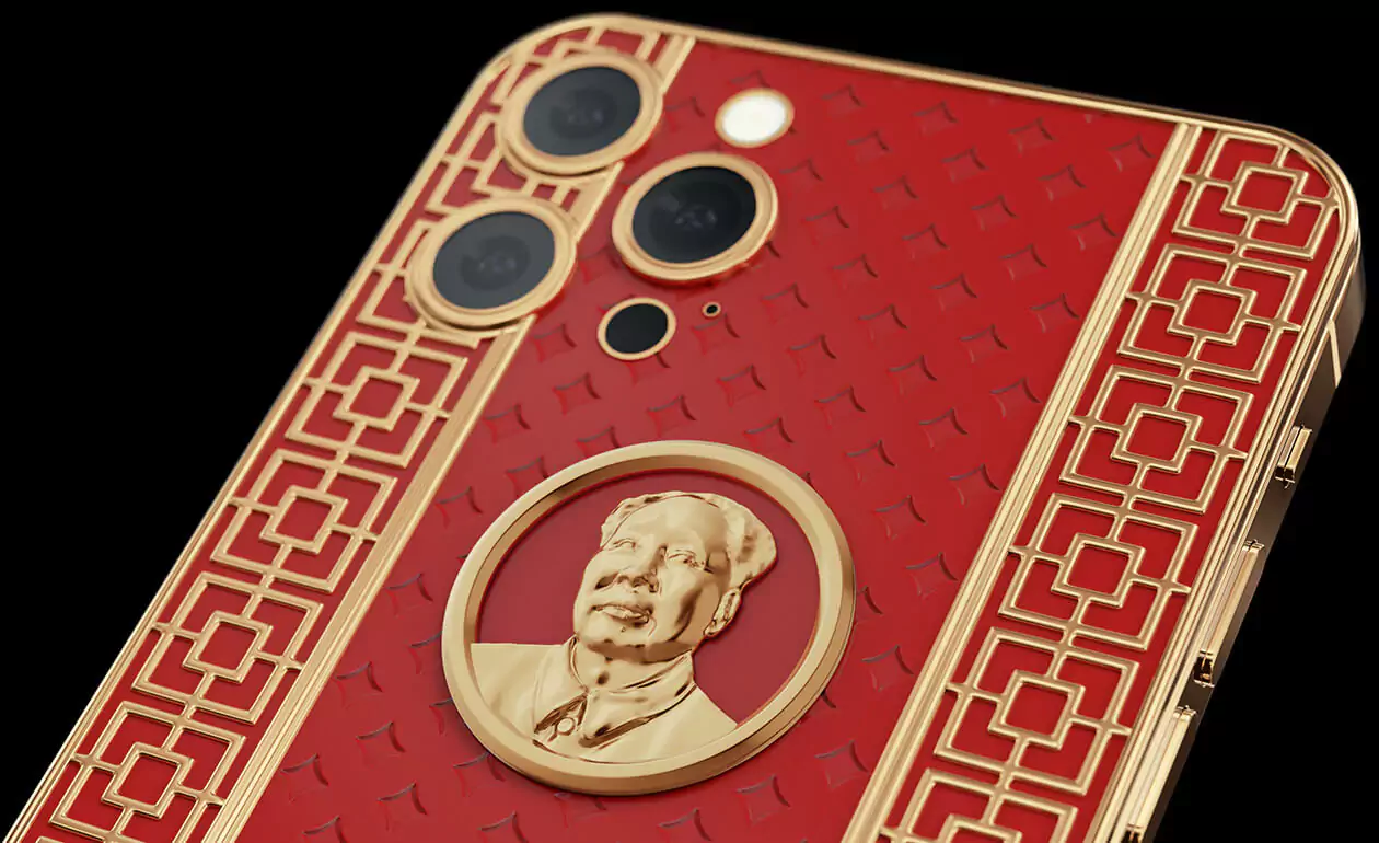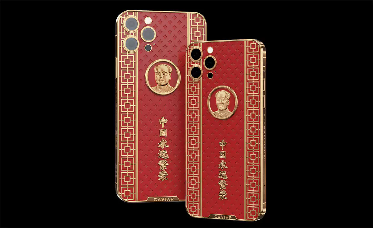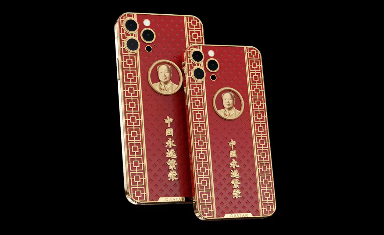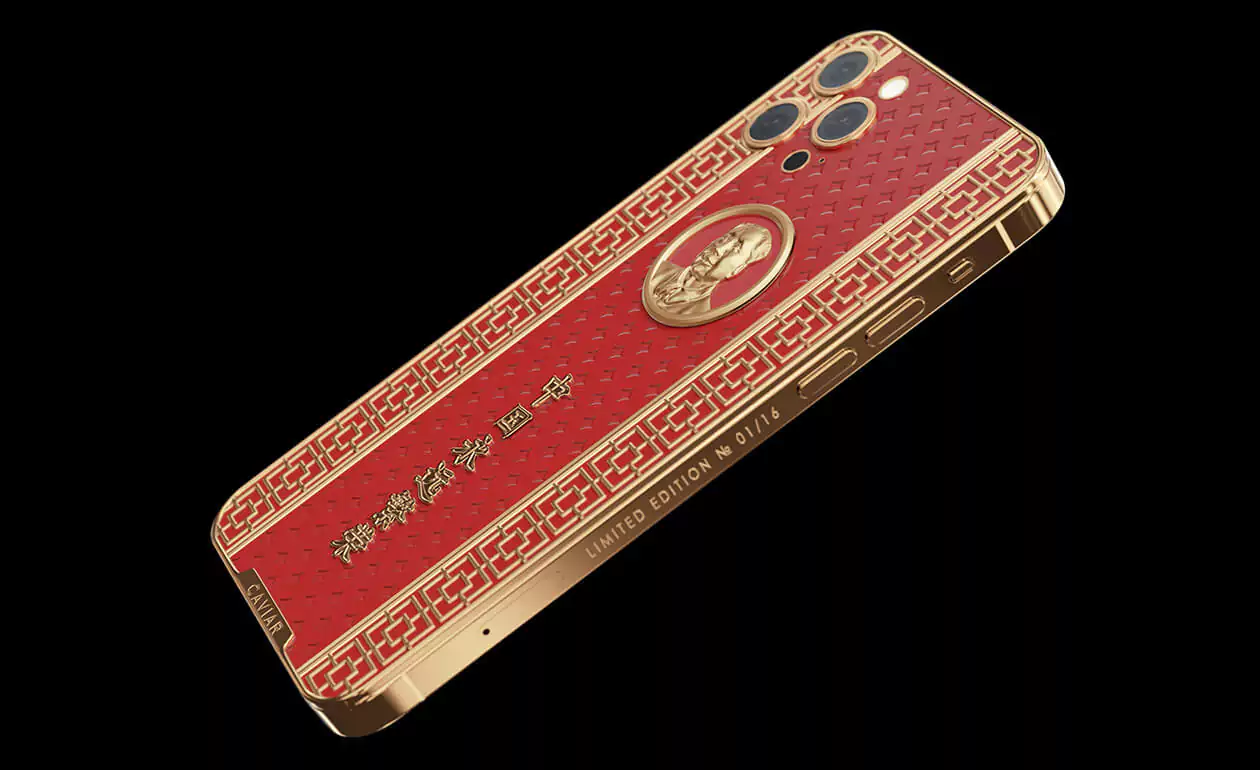 Caviar iPhone 12 Pro Mao Zedong is a smartphone design dedicated to the great politician. The case is made of red composite stone and decorated with a relief art engraving. In the center of the composition is a portrait of Mao Zedong made of 18-carat gold. National Chinese geometric ornaments are used in the decor. Inscribed in real gold: ""Eternally prosperous China.""