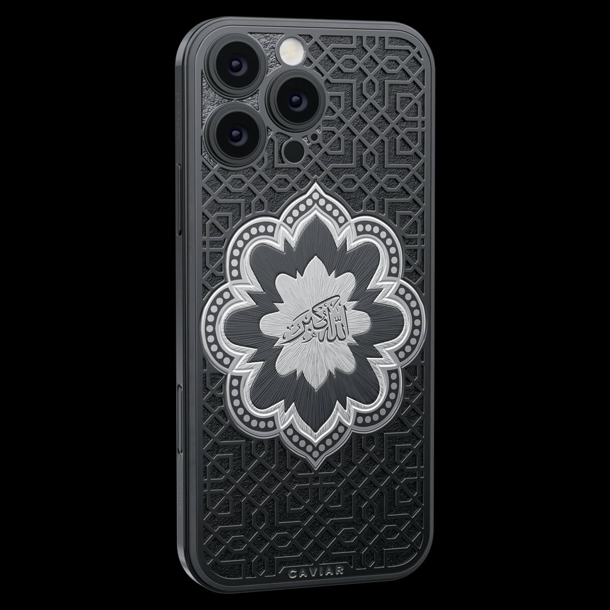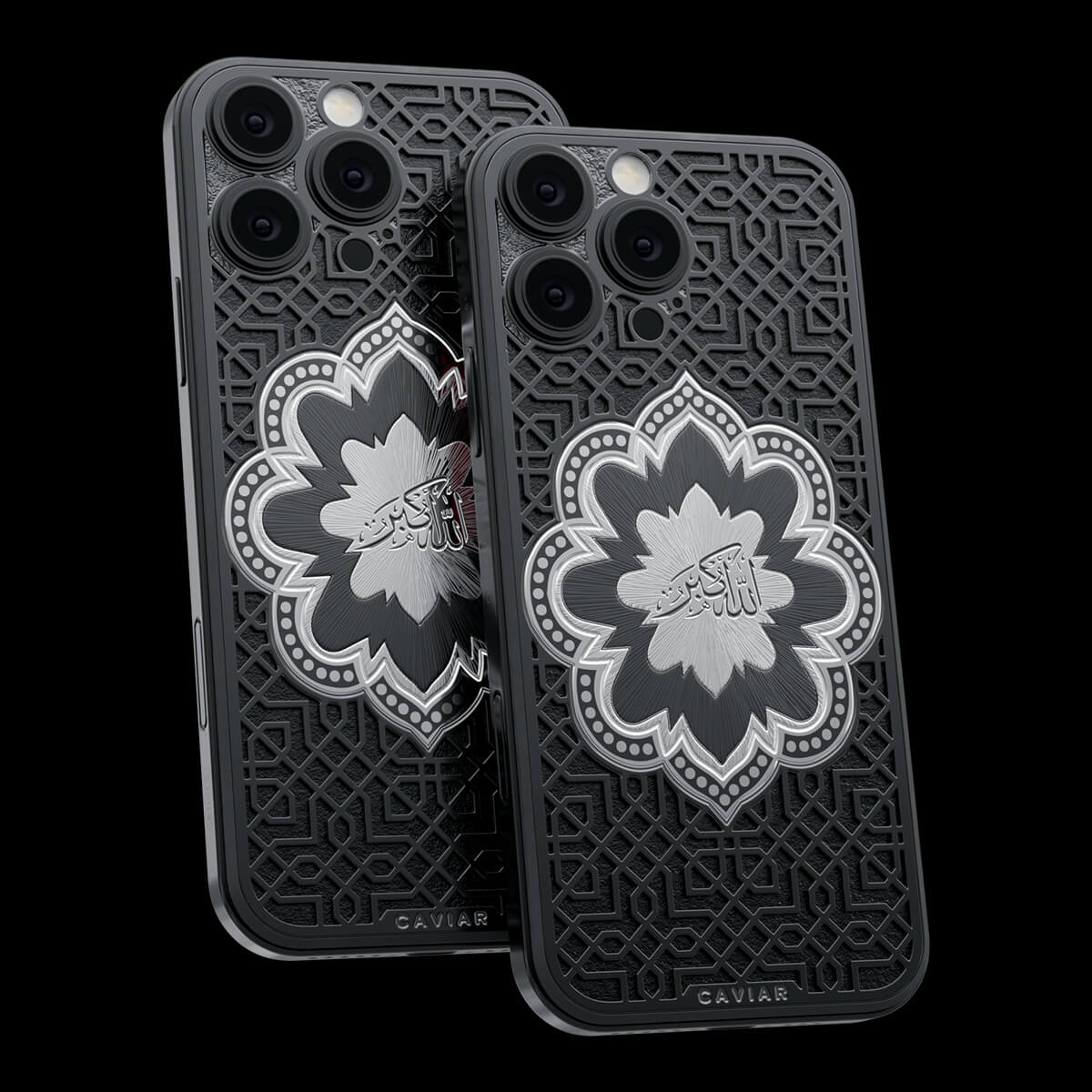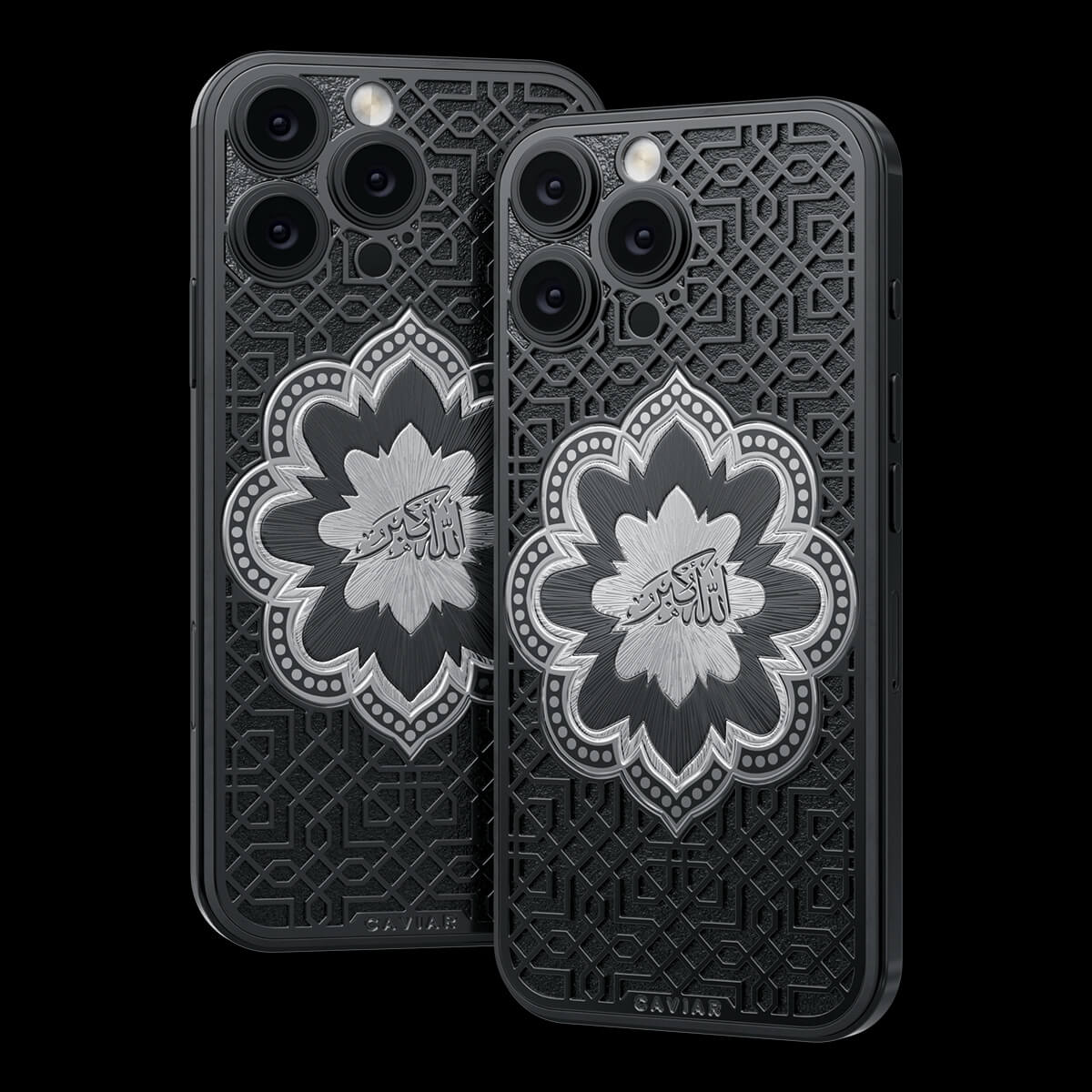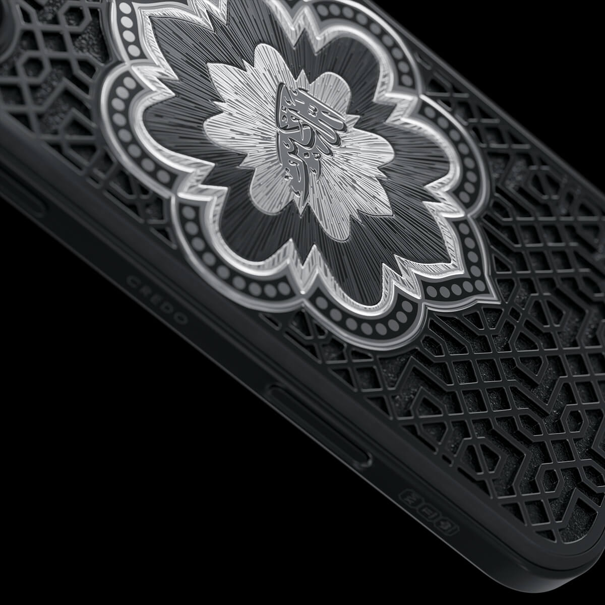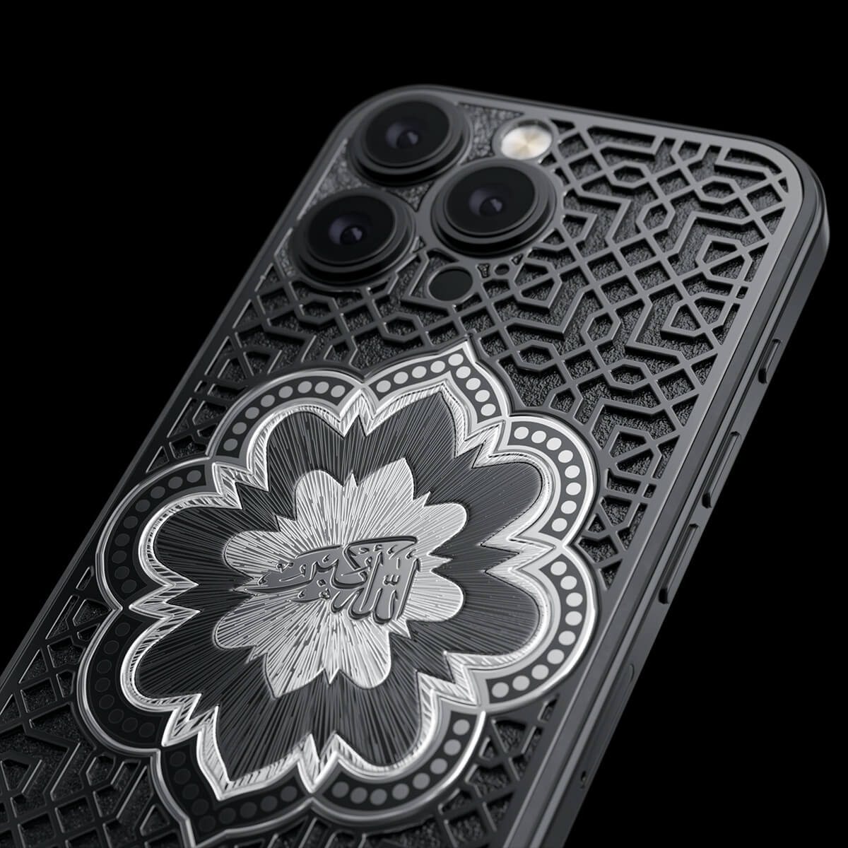 Introducing the «Reverence» smartphone. The central design element is an Eastern floral ornament, engraved with the Arabic inscription «Allahu Akbar» («God is Great») at its heart. The model features a minimalist black-and-silver color palette that emphasizes the nobility and depth of the symbolism.
