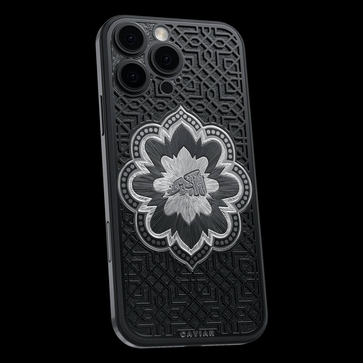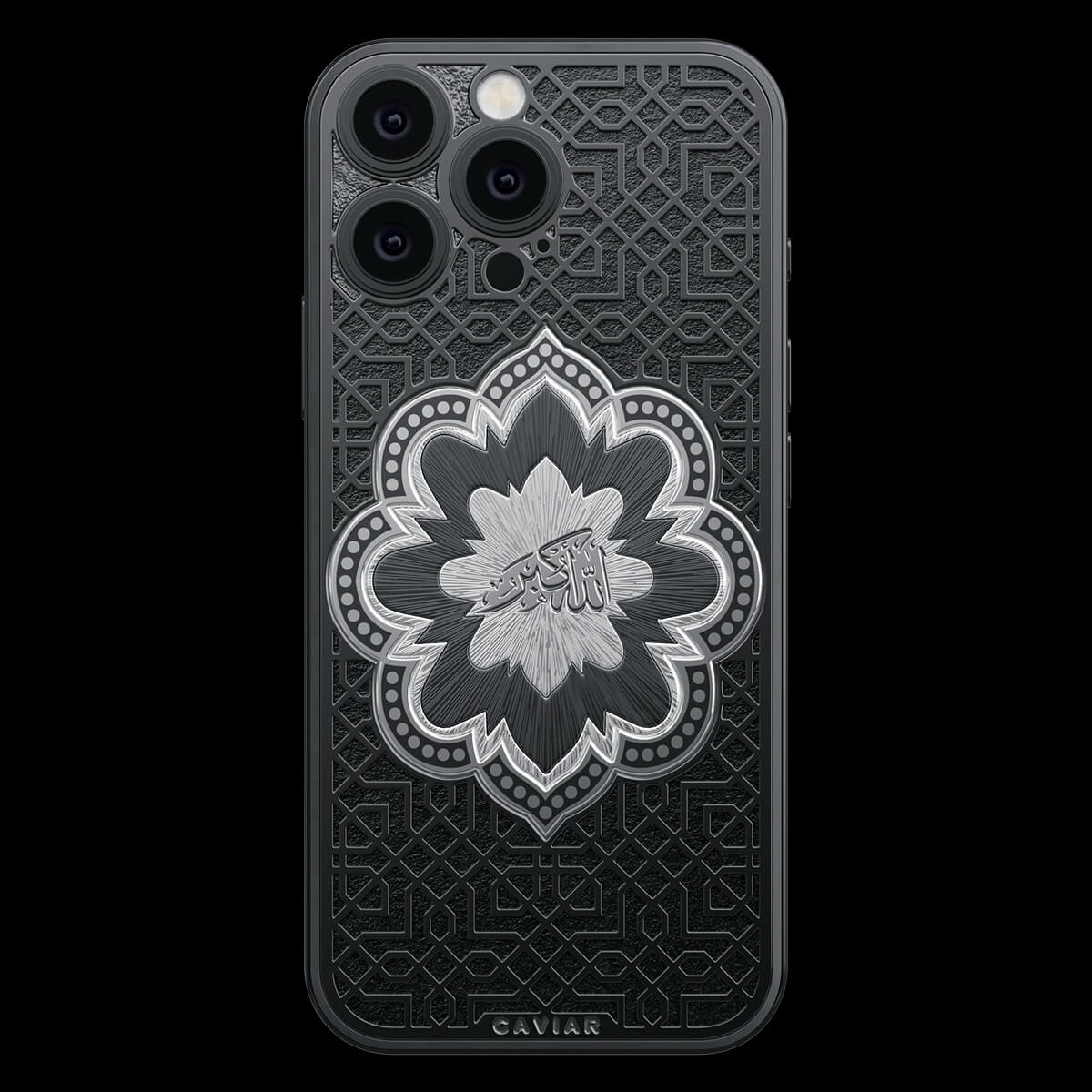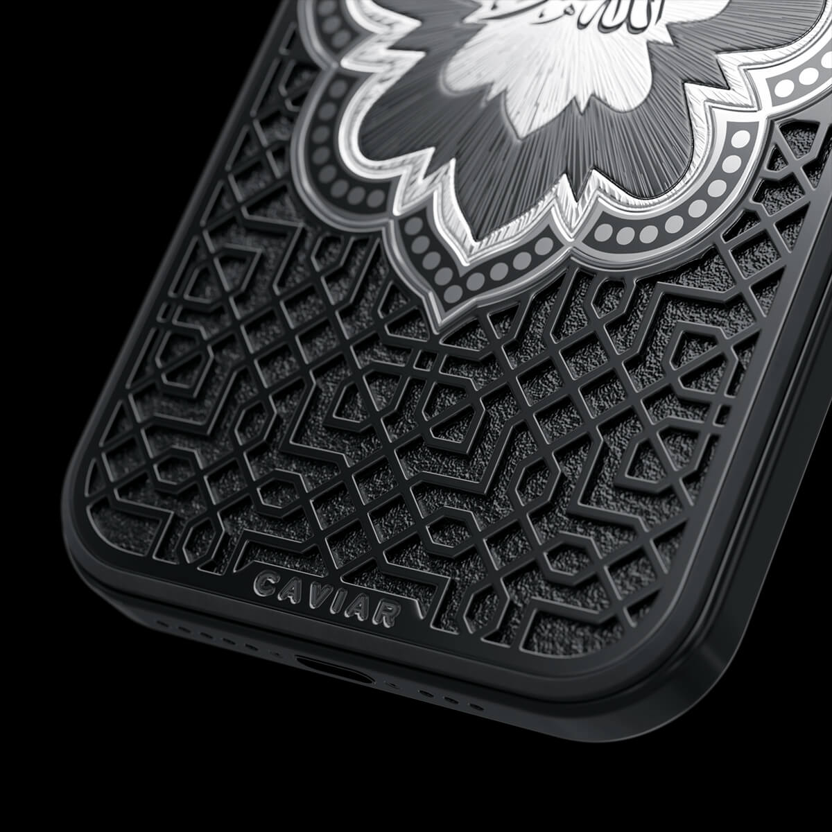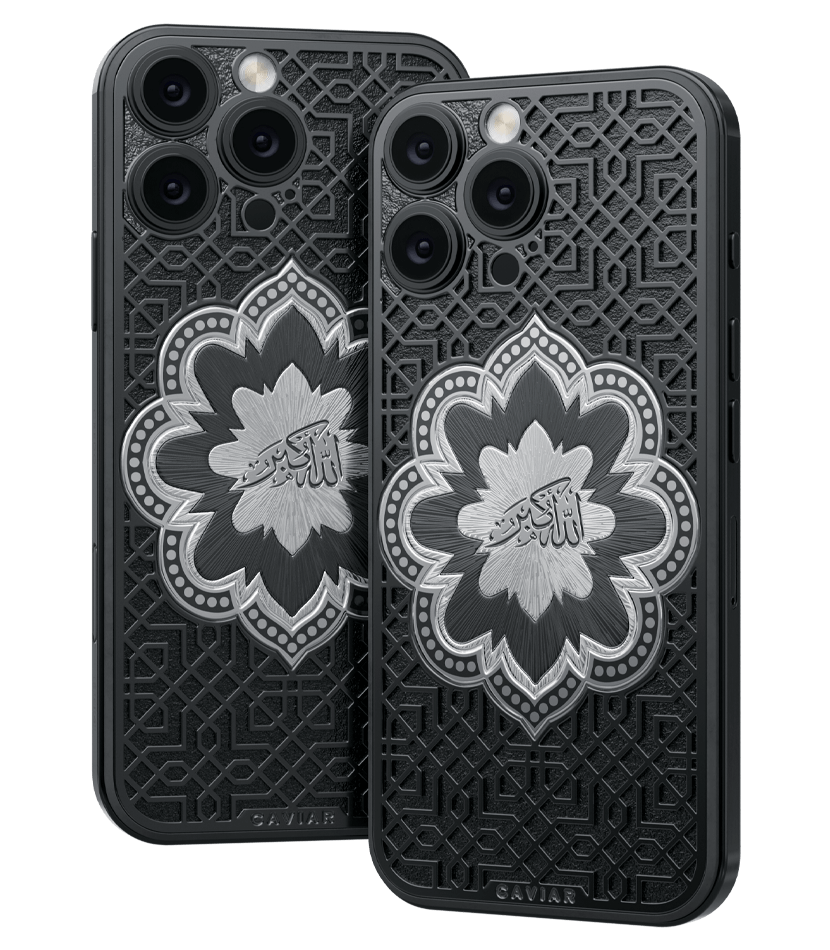 Introducing the «Reverence» smartphone. The central design element is an Eastern floral ornament, engraved with the Arabic inscription «Allahu Akbar» («God is Great») at its heart. The model features a minimalist black-and-silver color palette that emphasizes the nobility and depth of the symbolism.