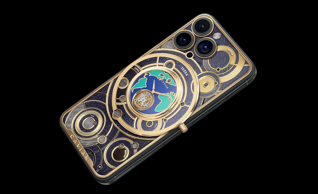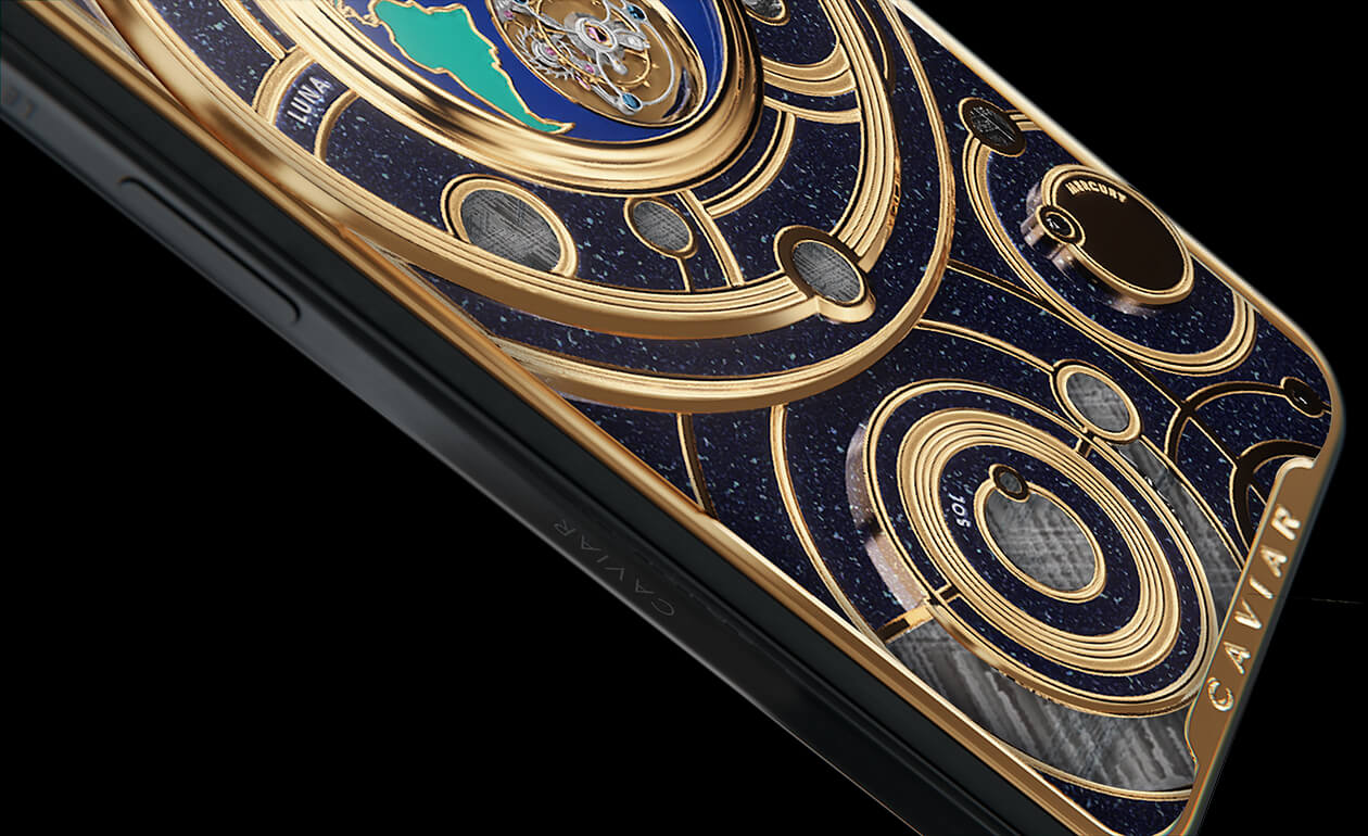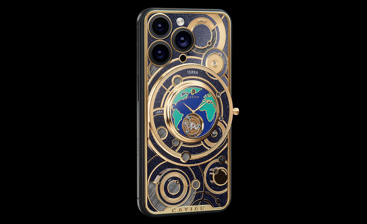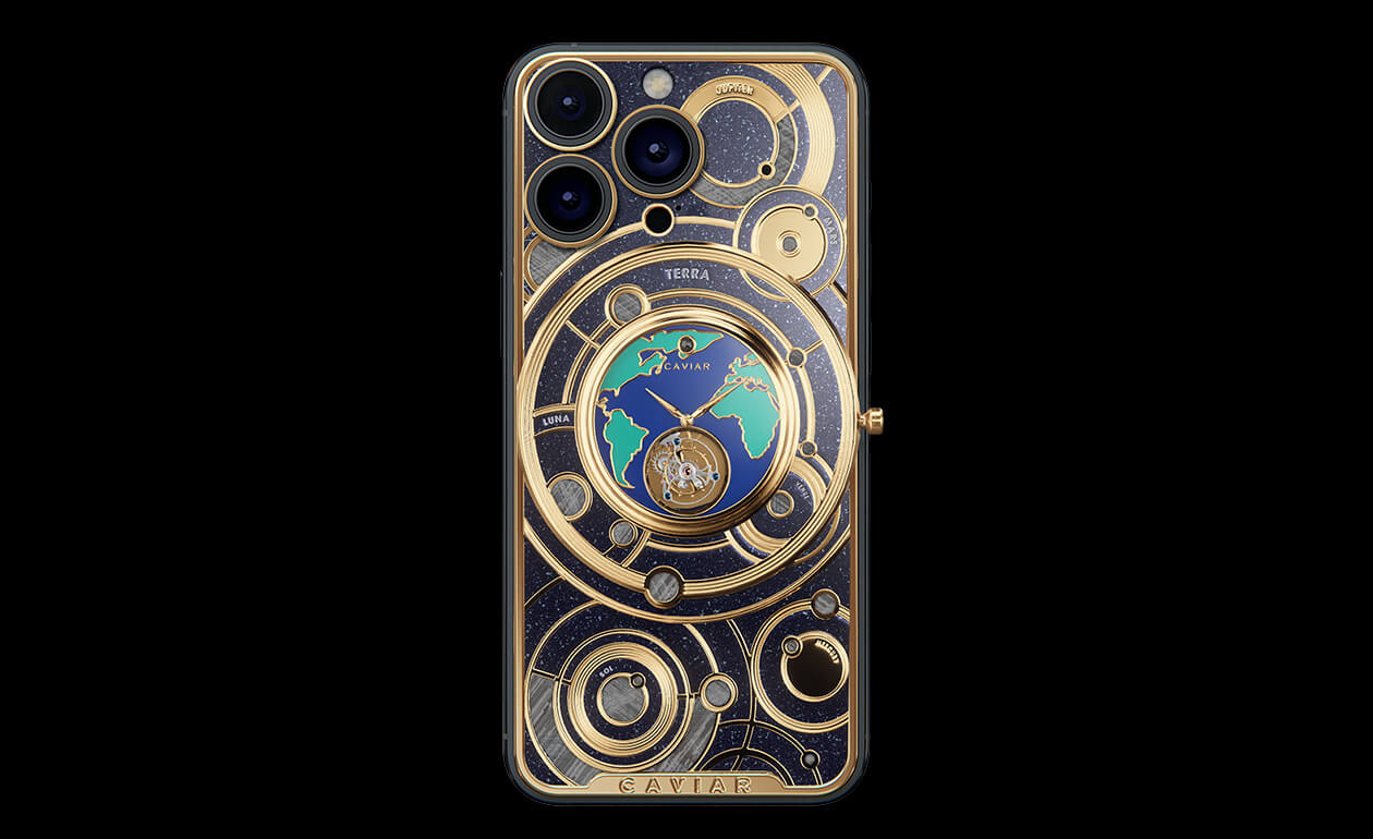 At the core, there is so well-loved iPhone design with a tourbillon watch. The fascinating tourbillon rotation accurately reflects the specifics of the planets’ movement in the orbit. The exaggerated cyclicity enclosed in the endless gold circles seems to convey the very essence of the space nature: the endless movement of many system elements.
