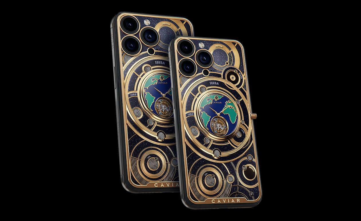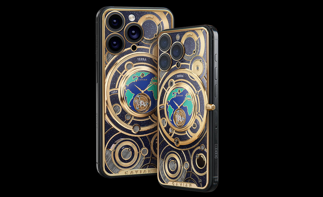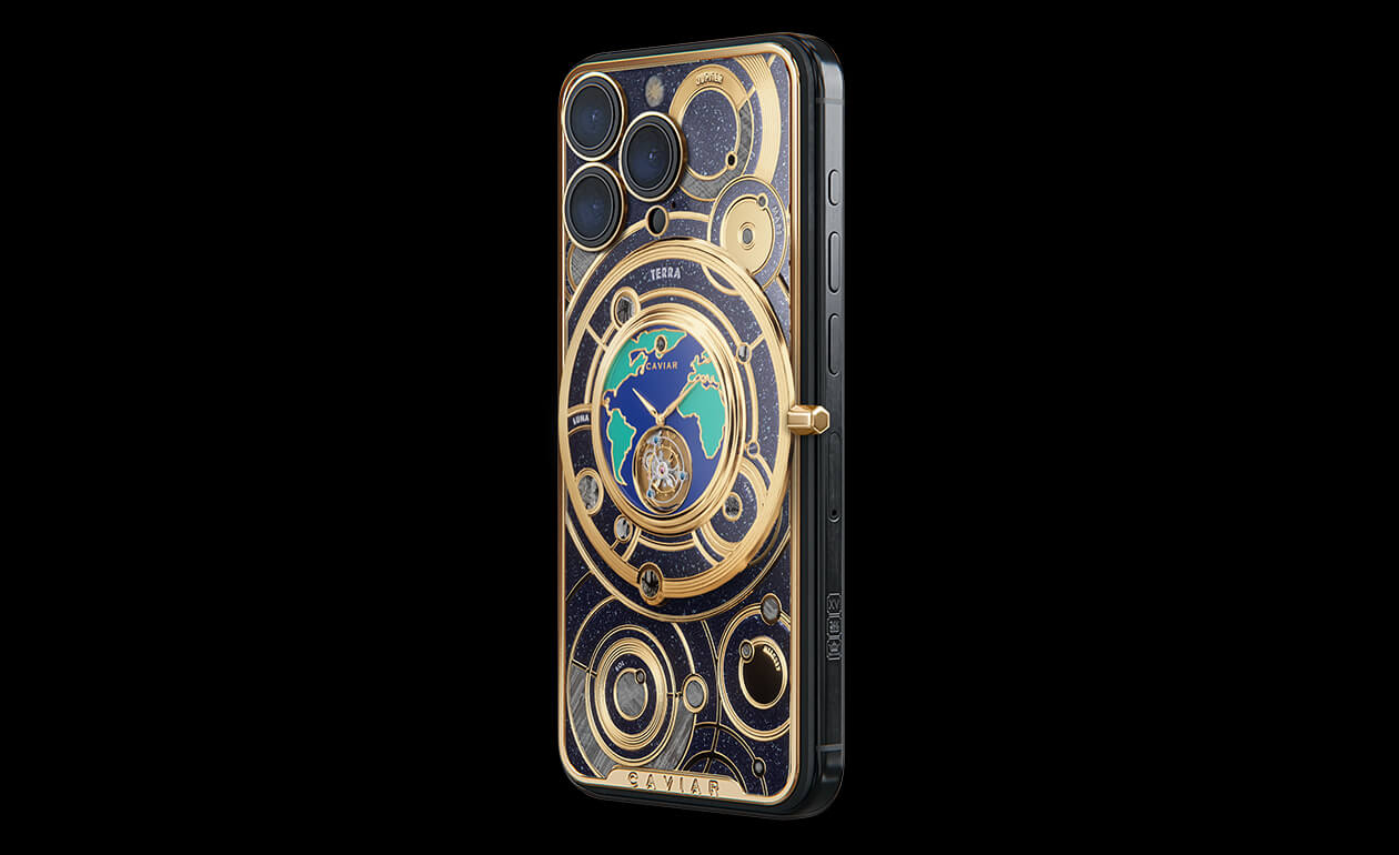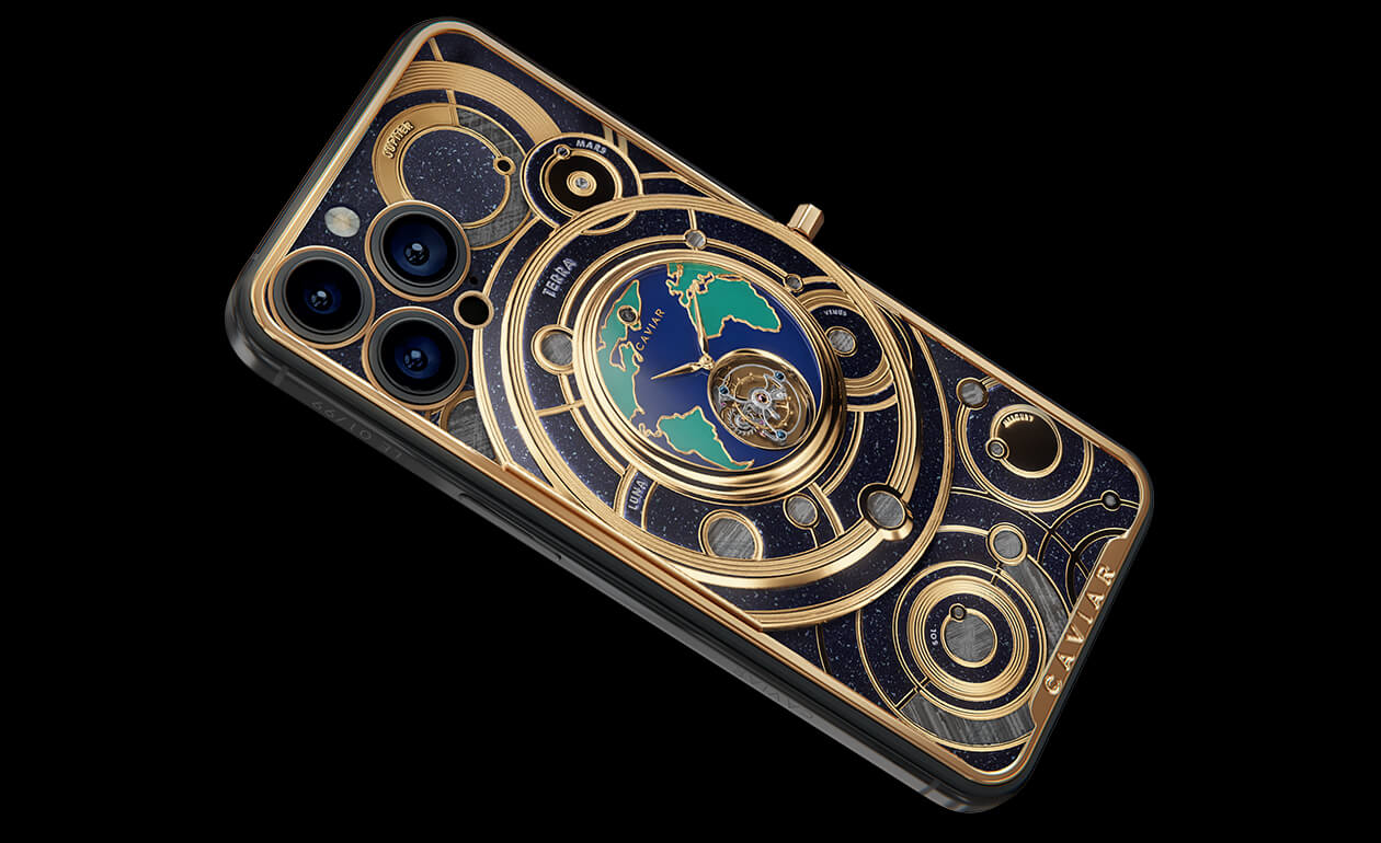 At the core, there is so well-loved iPhone design with a tourbillon watch. The fascinating tourbillon rotation accurately reflects the specifics of the planets’ movement in the orbit. The exaggerated cyclicity enclosed in the endless gold circles seems to convey the very essence of the space nature: the endless movement of many system elements.