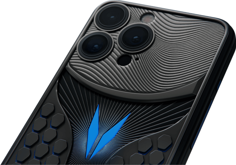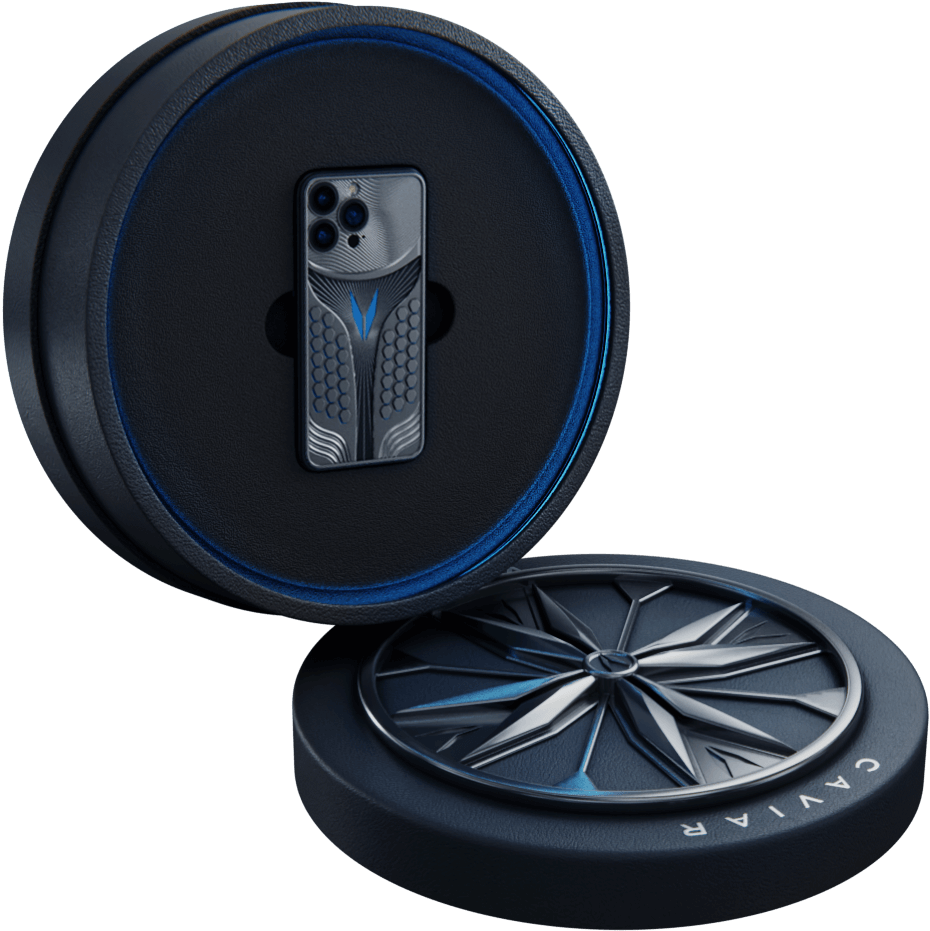 Caviar presents a unique iPhone inspired by the futuristic Mercedes Vision Avtr, a car styled after the movie "Avatar". The smartphone is crafted from durable titanium with colored accents and a light blue backlight, embodying the concept car's design with its bionic flaps that give it an otherworldly appearance.