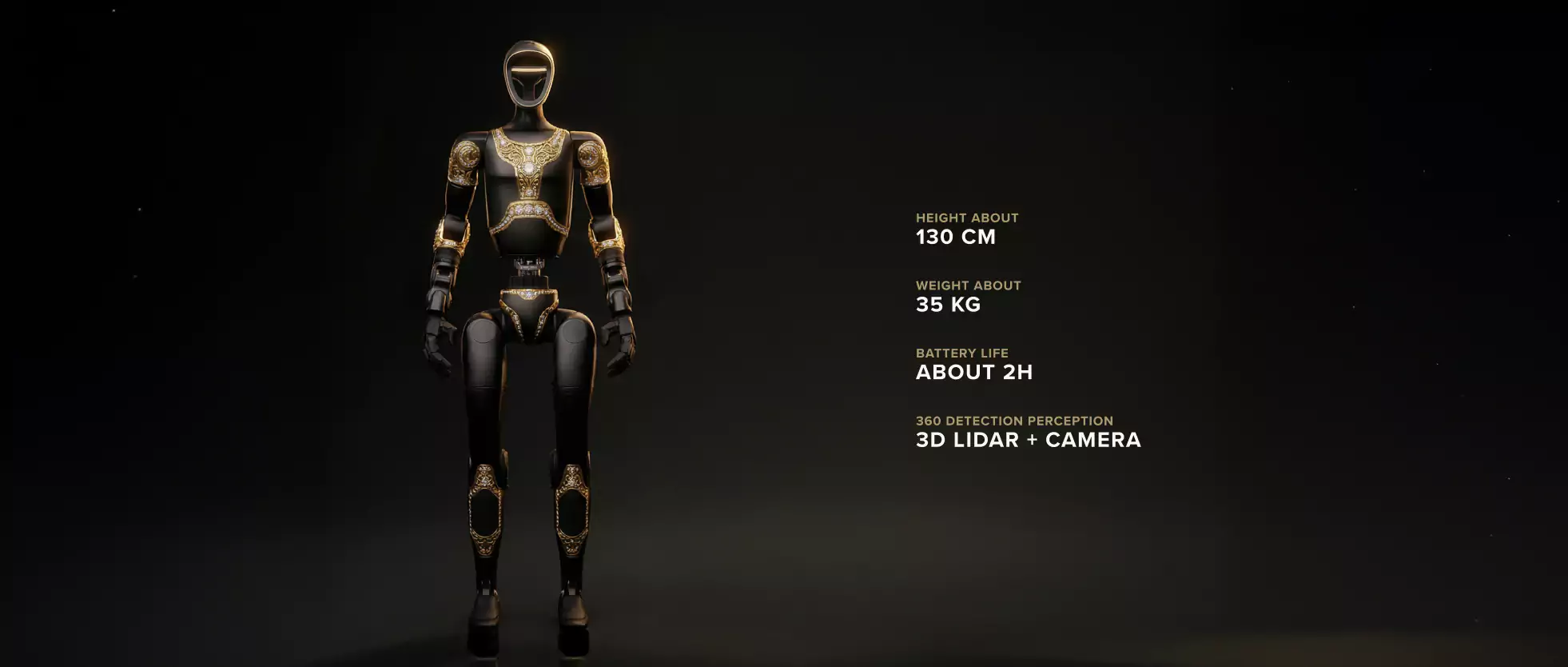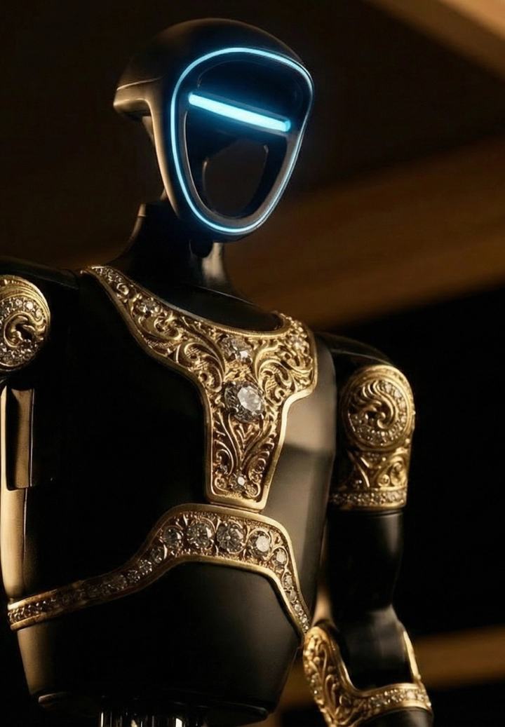 Aladdin captivates at first glance, uniting futurism with Eastern decorative tradition. Its body is finished in deep black and adorned with delicate gilded patterns. Arabesques and ornamental motifs cover the panels and joints, giving the robot the appearance of a luxurious artifact that guards an ancient secret. Black symbolizes depth and the infinity of knowledge, while gold represents power, wisdom, and value. In motion, the gilding shimmers softly, creating the impression of a living treasure from an Eastern legend.